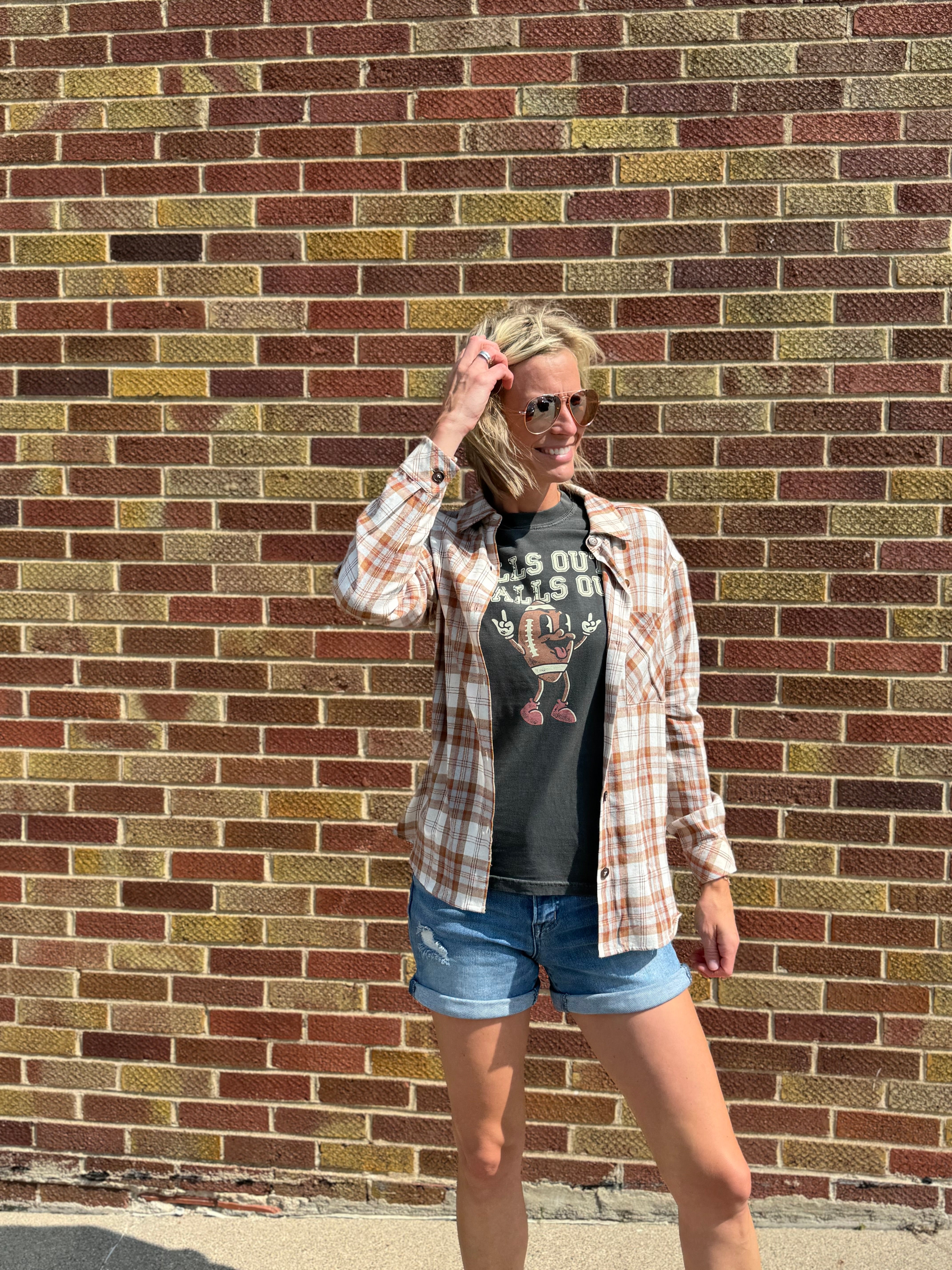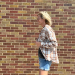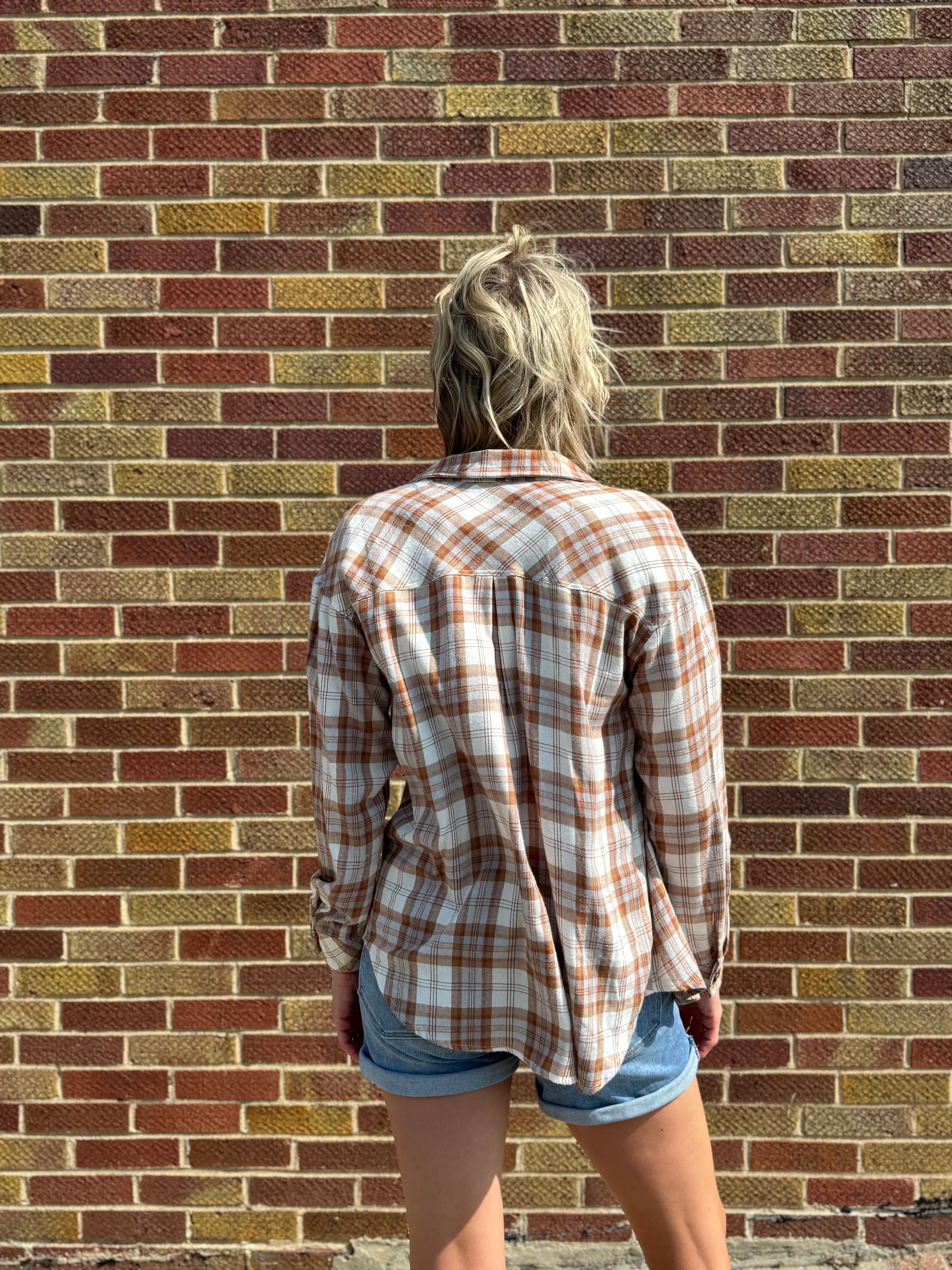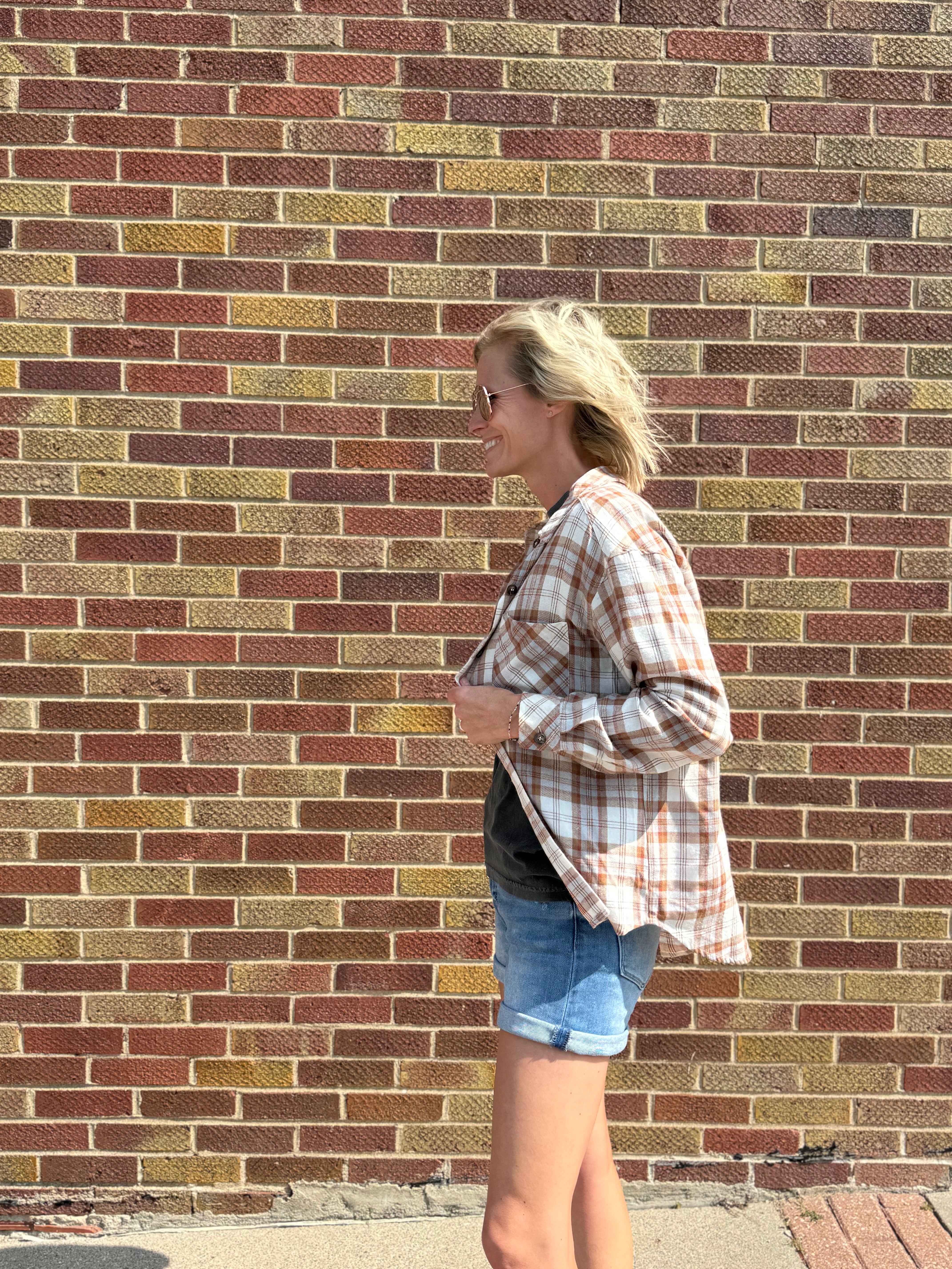 The Round Hem Plaid Button Down Shirt w/Front Pocket has four different colors for you to choose from. It comes in Rust, Dark Olive, Carmel, and Sage. These colors are warm and earthy, perfect for the fall season. The fabric on this button down is also light weight making it super easy and comfortable for everyday activities