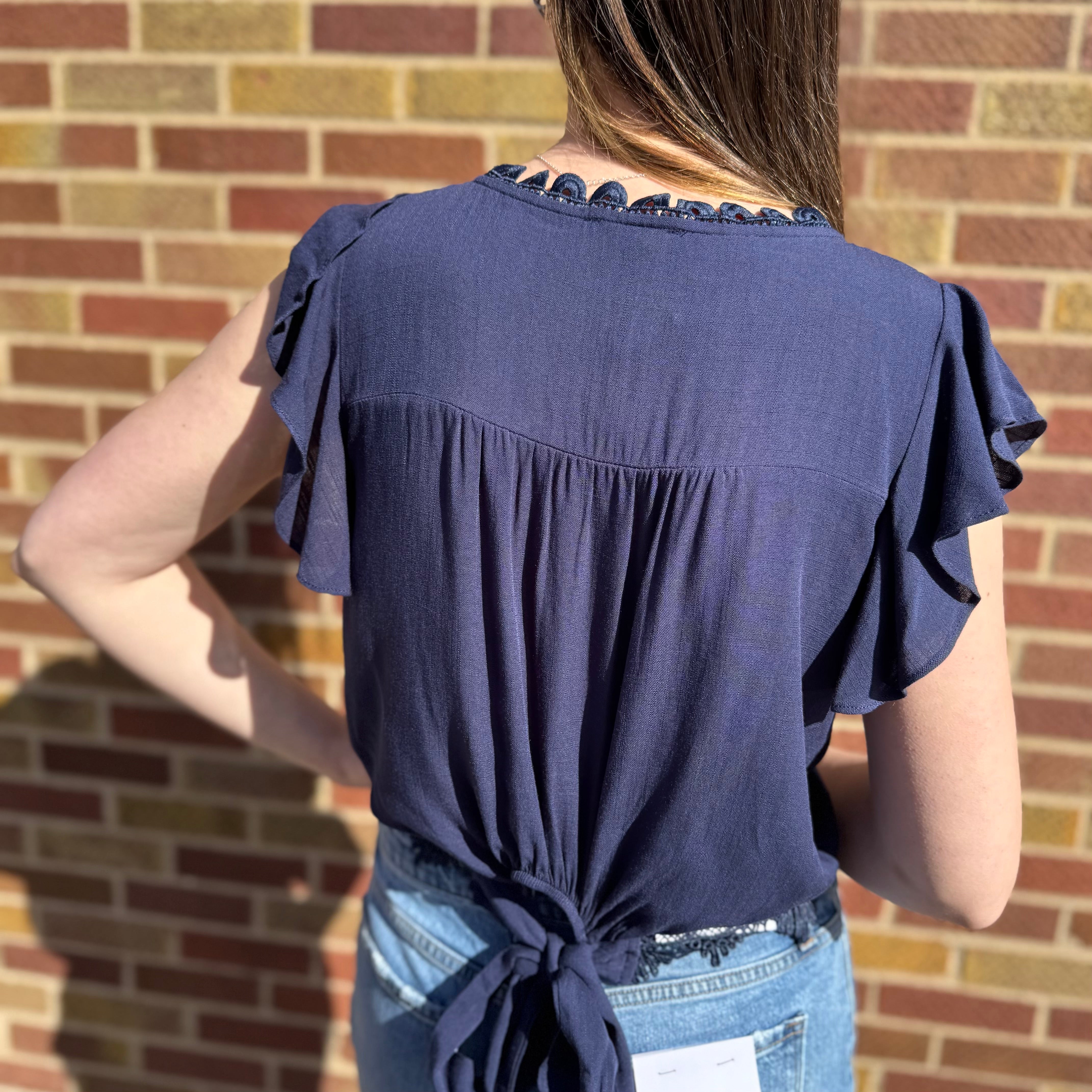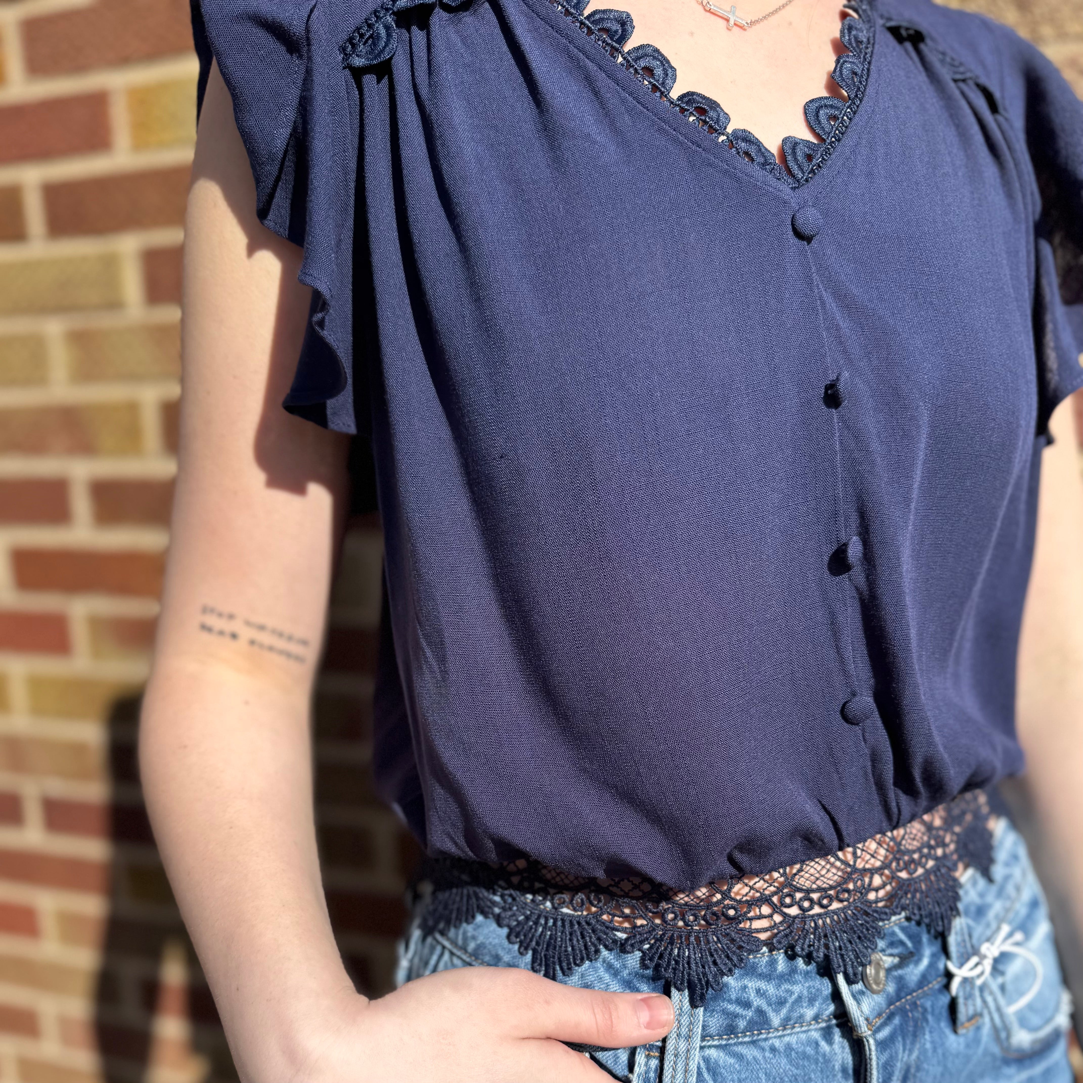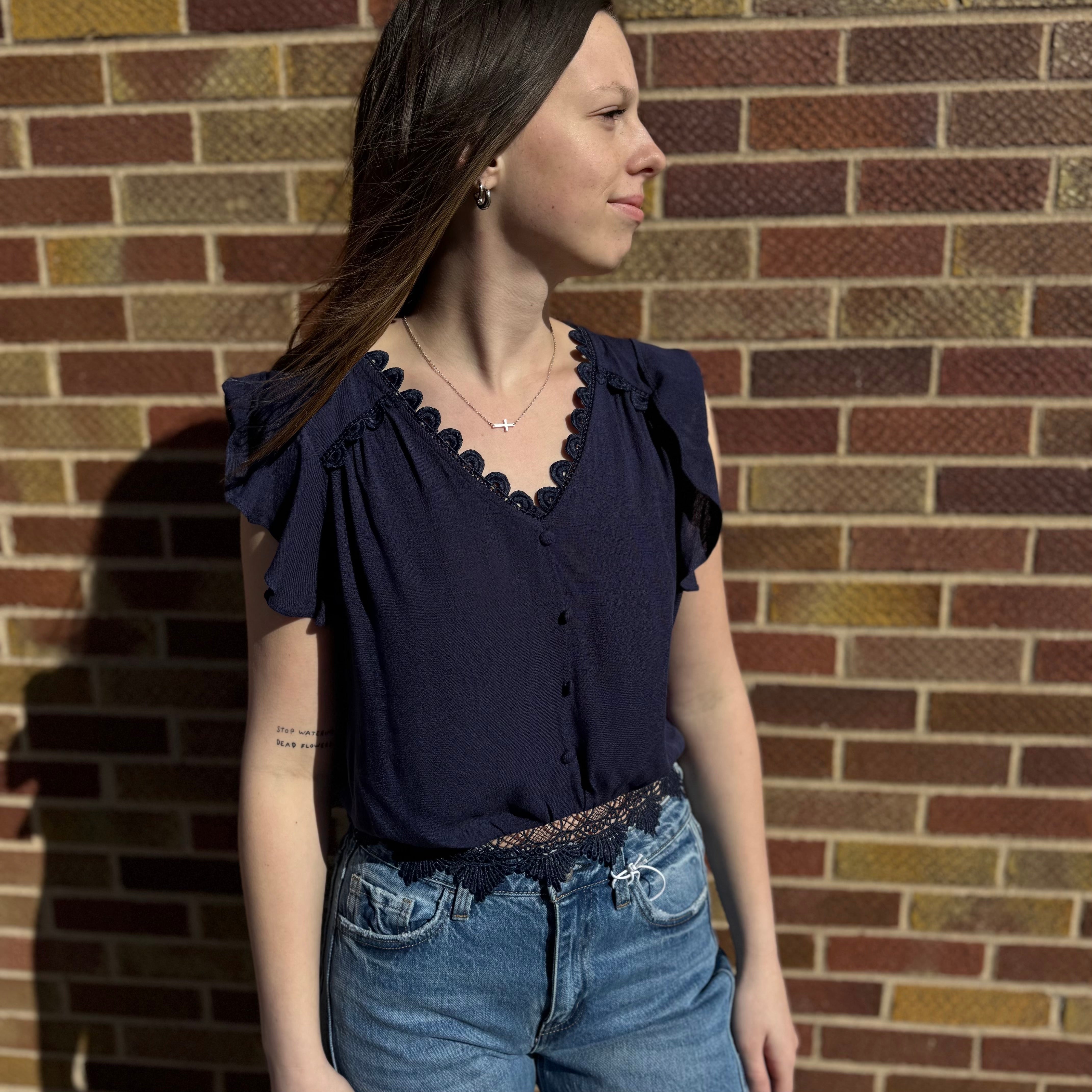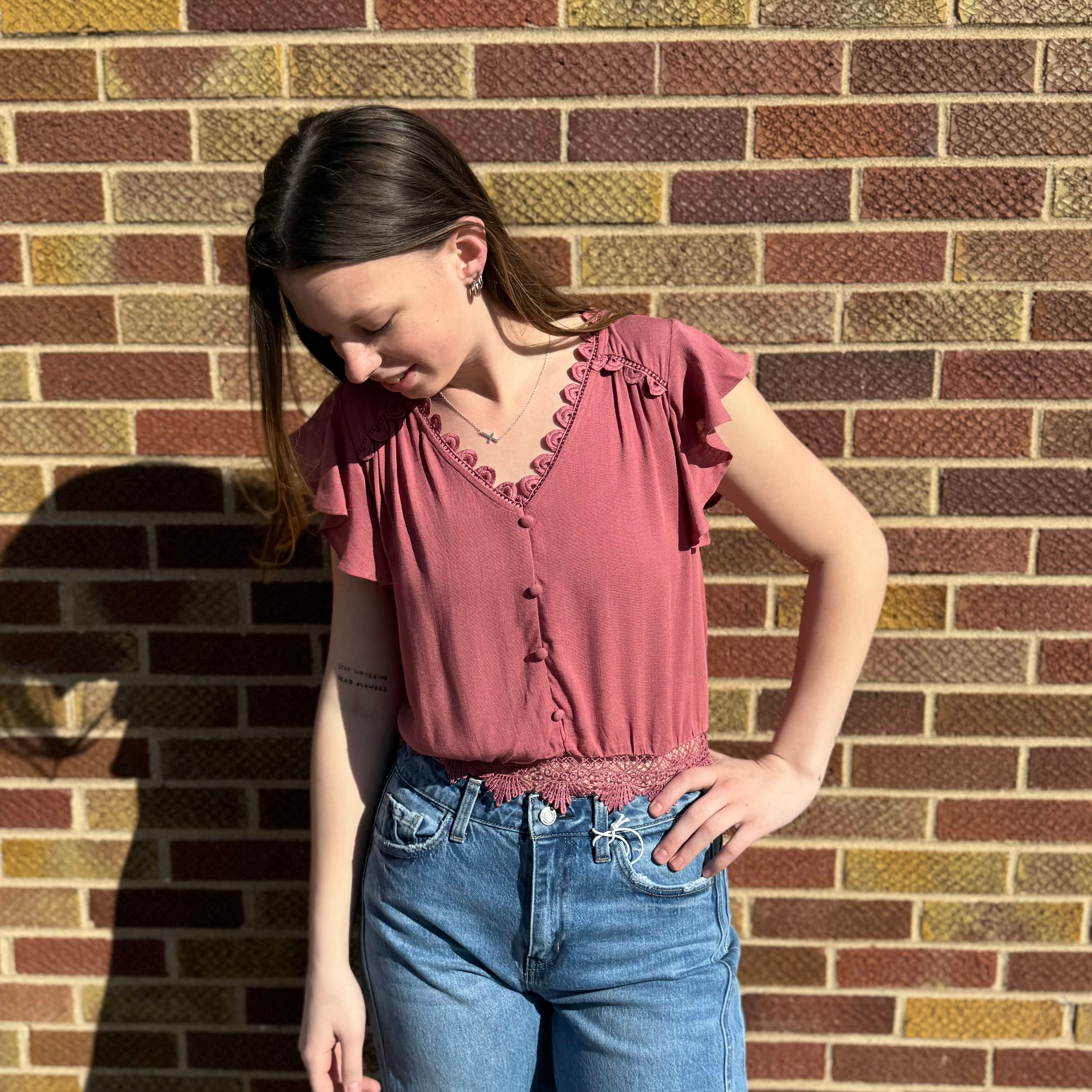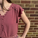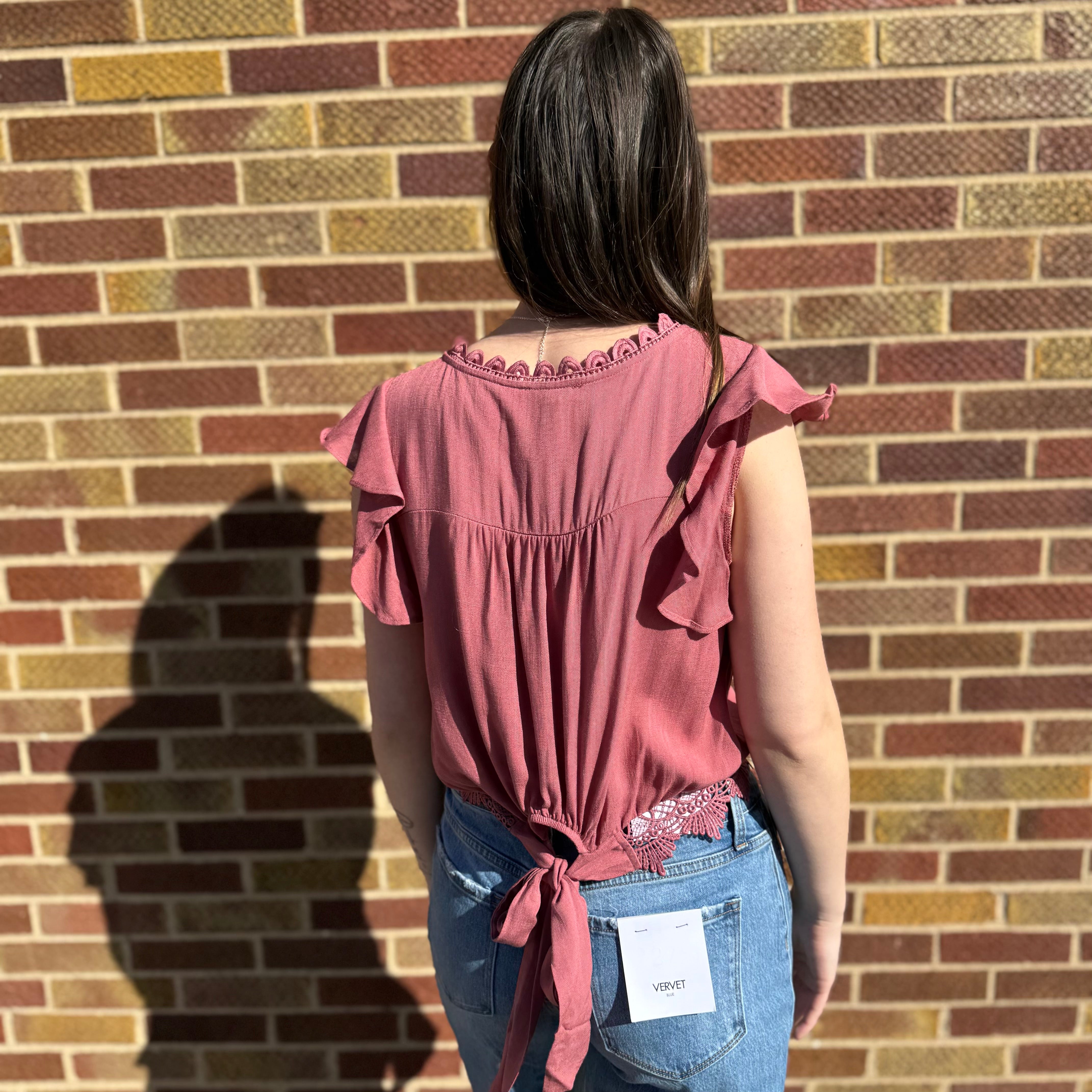 Step up your crop top game with our adorable Scallop Lace Back Tie Crop Top. Choose from navy or mauve for a pop of color, while the ruffle sleeve and decorative buttons add a touch of sweetness. And don't forget the scalloped lace neckline and hem for a flirty, feminine touch. Get ready to turn heads in this must-have top!