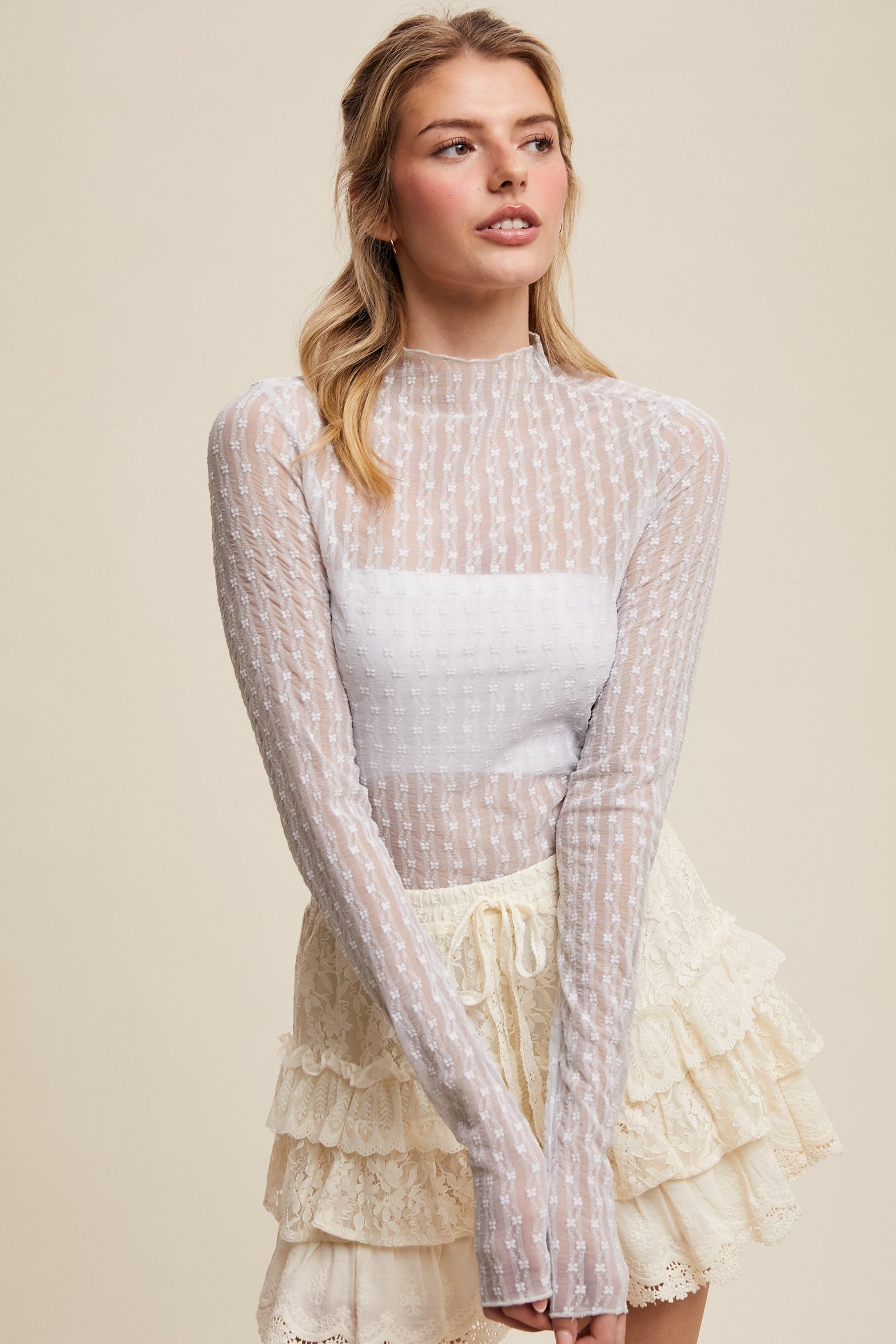 Elevate your layering game with this stunning off-white lace top! Featuring an intricate floral design and semi-sheer fabric, it's the perfect piece to wear over your favorite cami or slip. Long sleeves add sophistication while the delicate lace keeps things romantic and fun. Style it solo for a bold statement or layer it for endless outfit possibilities. Versatile, feminine, and totally swoon-worthy—this top is about to become your new styling secret weapon!