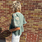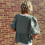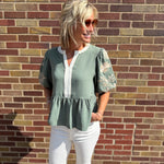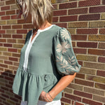 Solid Peplum Top w/Puff Embroidered Sleeve