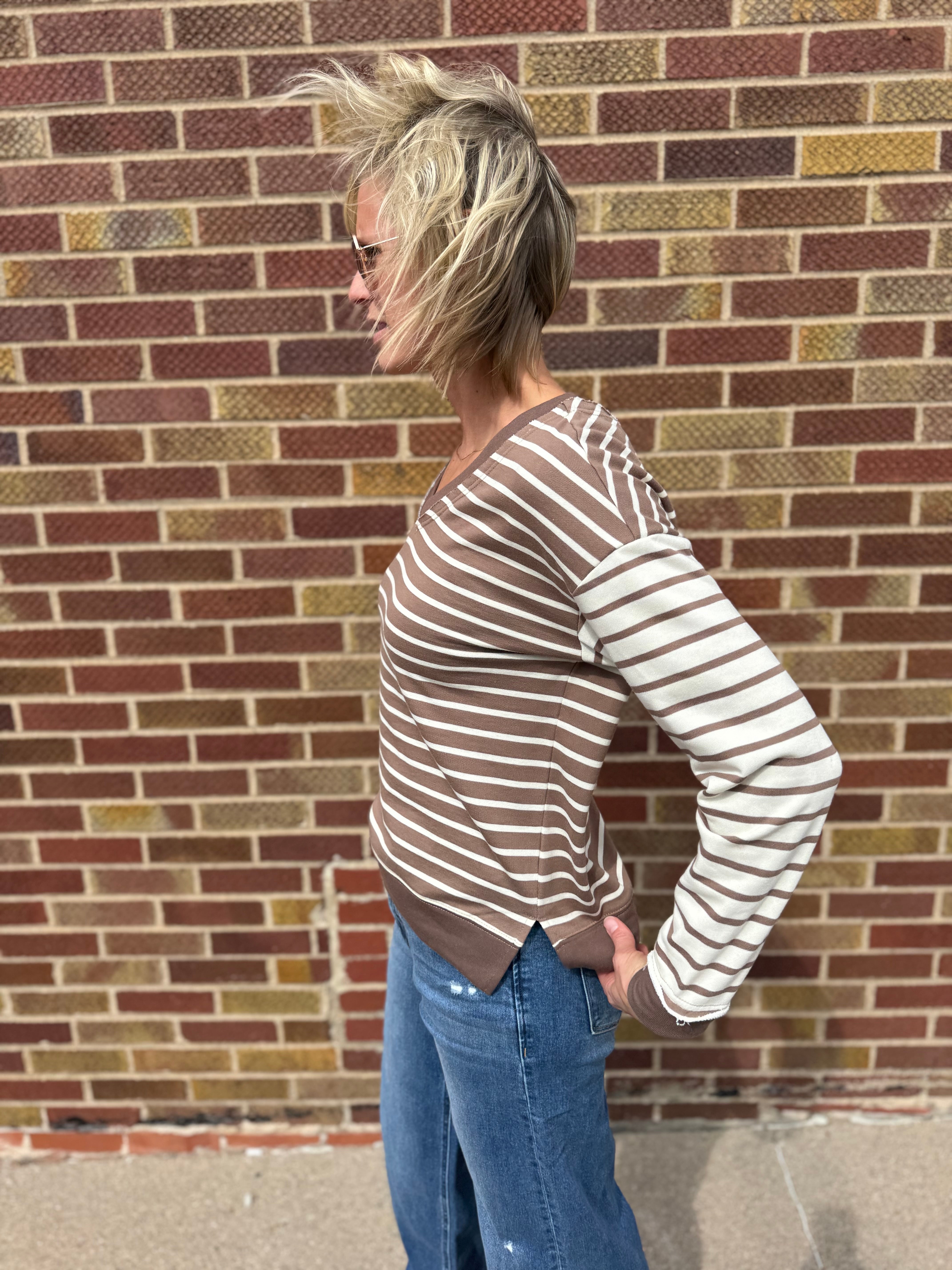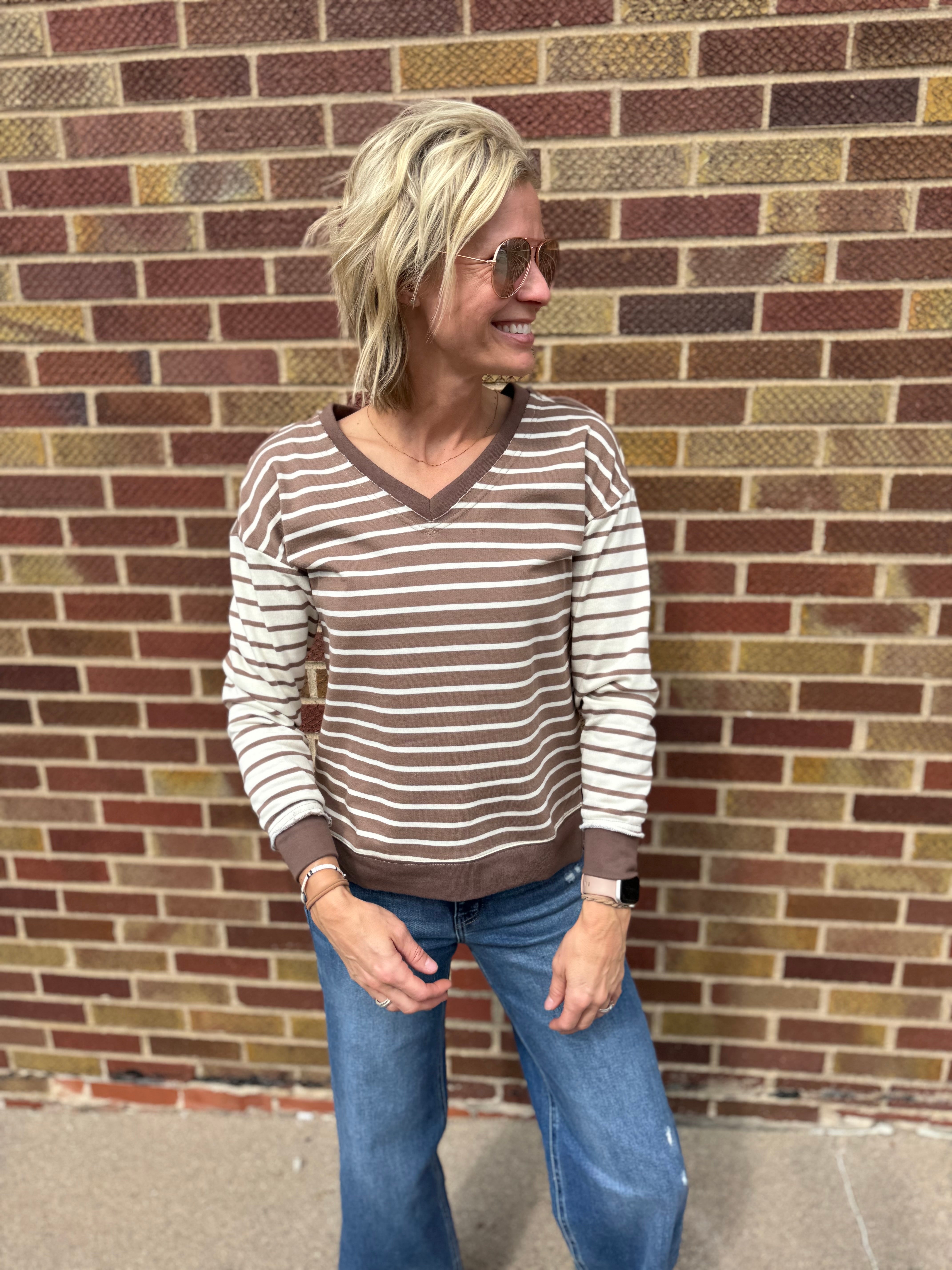 Add a splash of fun to your casual wardrobe with the Stripe French Terry V-Neck Sweatshirt. Its soft terry fabric feels like a warm hug, while the playful stripes and flattering V-neck bring a fresh, lively vibe to your everyday look. Perfect for relaxed days with a touch of style!