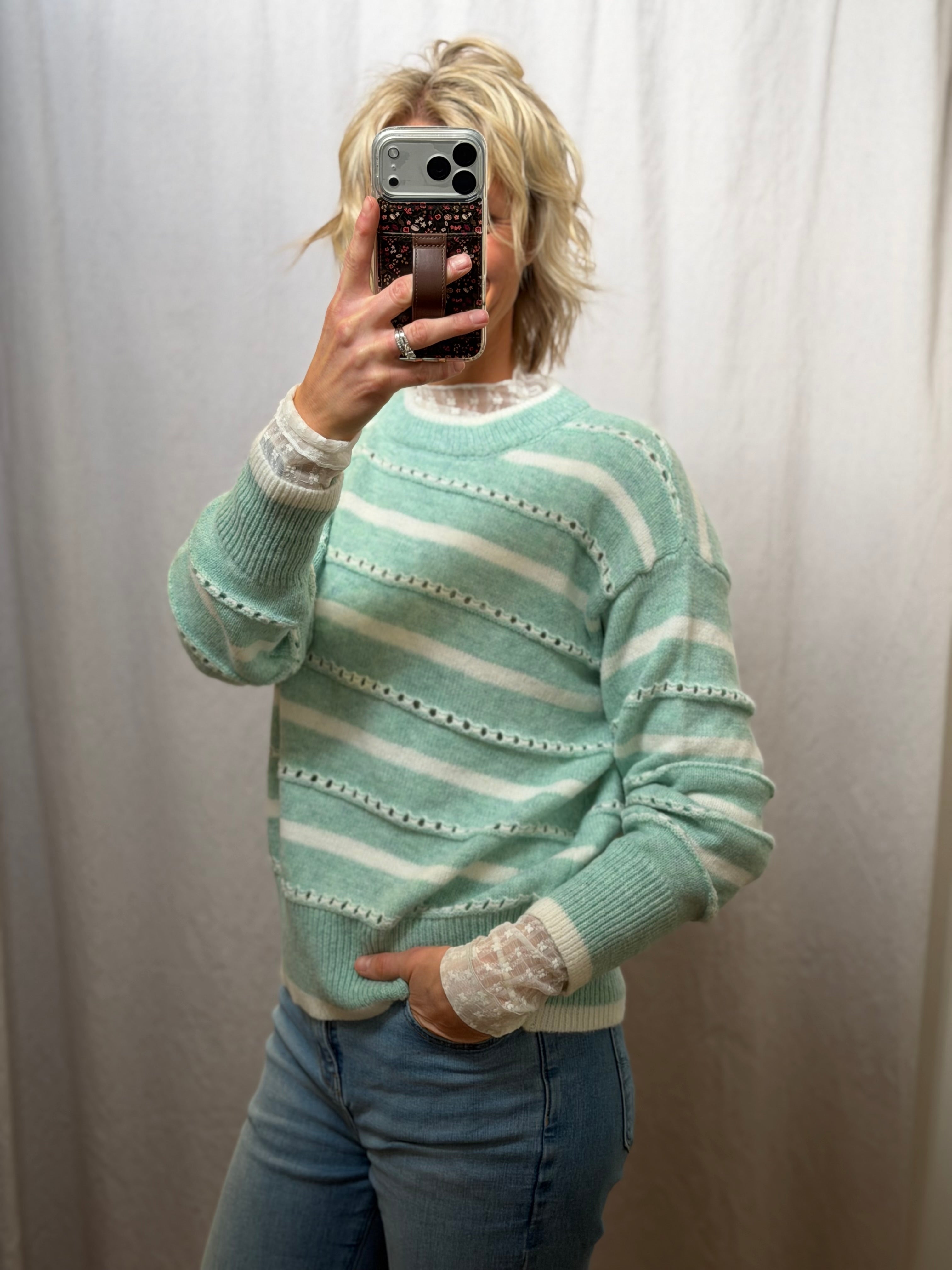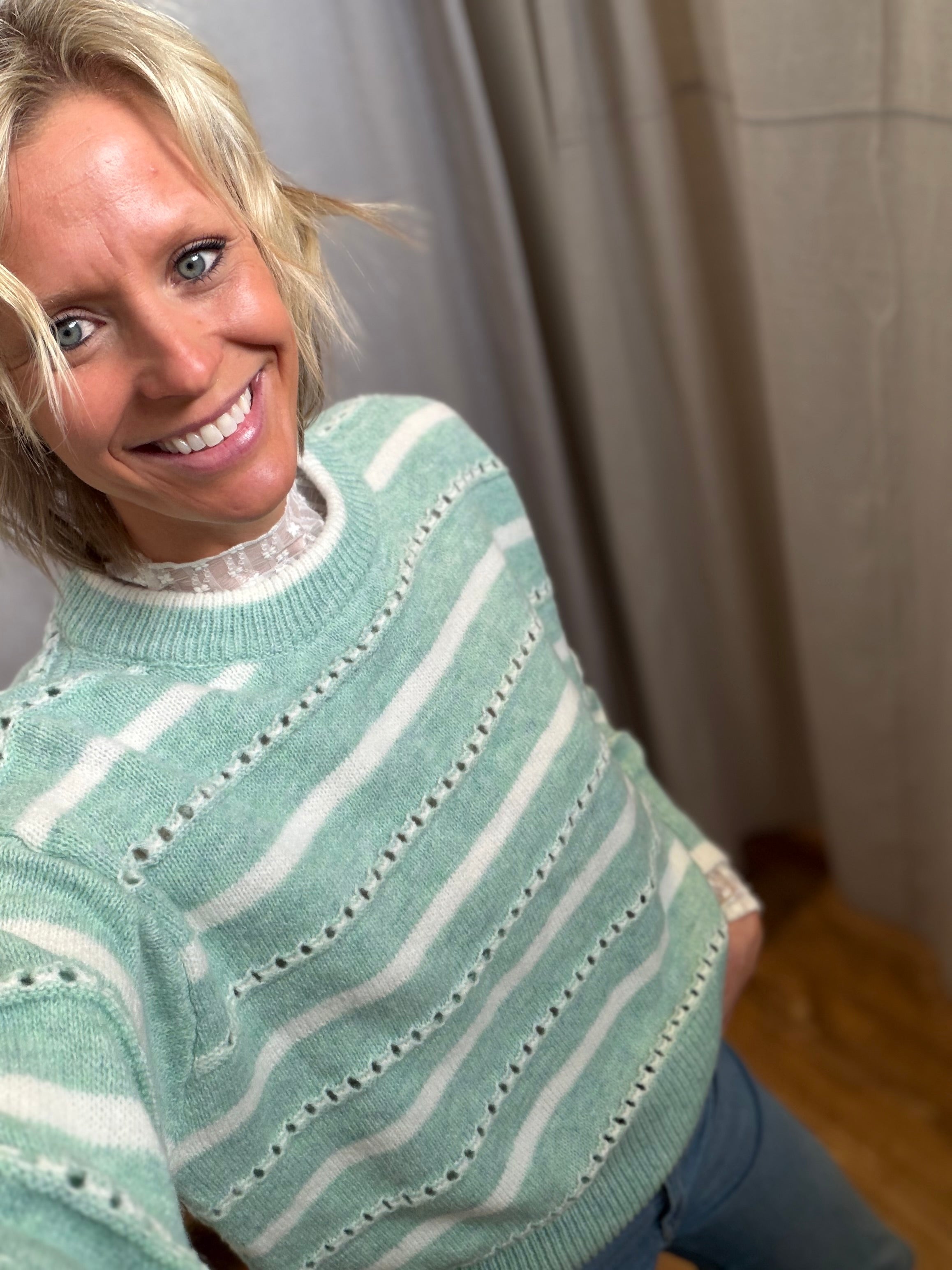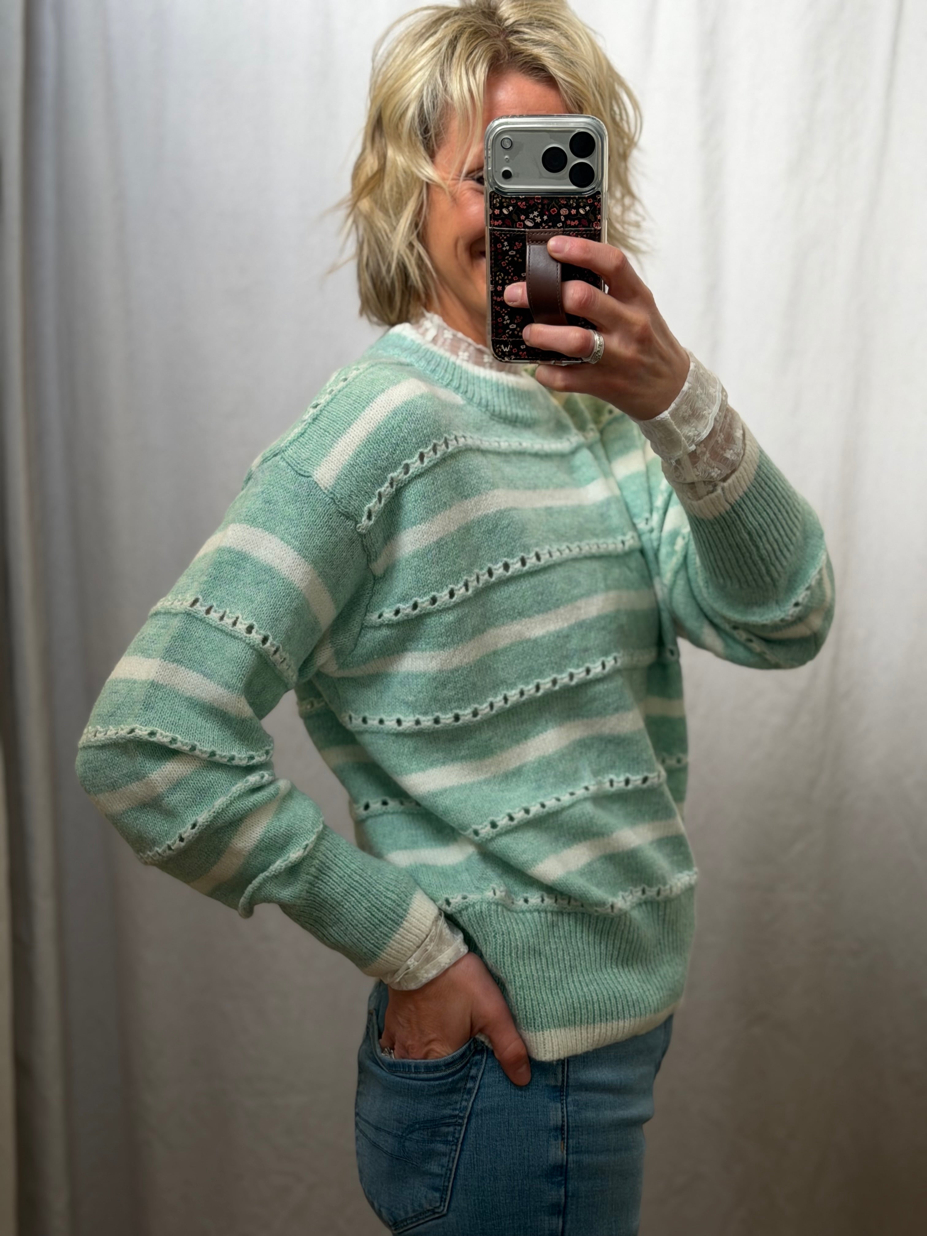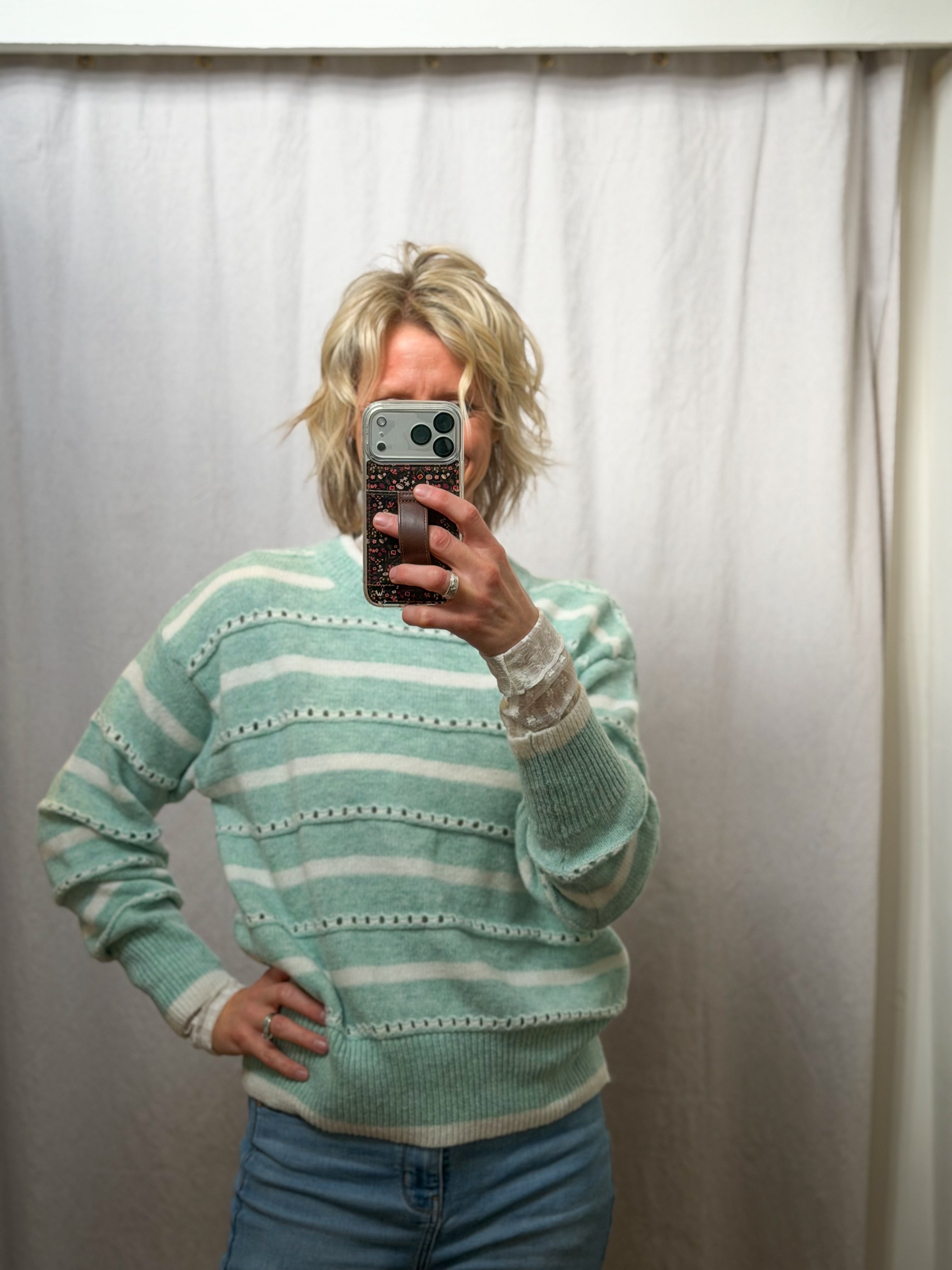 Cozy up in this playful striped pullover that's equal parts chic and comfy. The white and teal stripes bring a fresh, breezy vibe, while the open stitch detailing adds an effortless, laid-back edge. Perfect for layering or wearing solo, this sweater transitions seamlessly from casual coffee runs to weekend hangouts. Lightweight enough for spring but substantial enough to keep you warm when the temperature dips. Your new go-to piece for looking put-together without trying too hard.