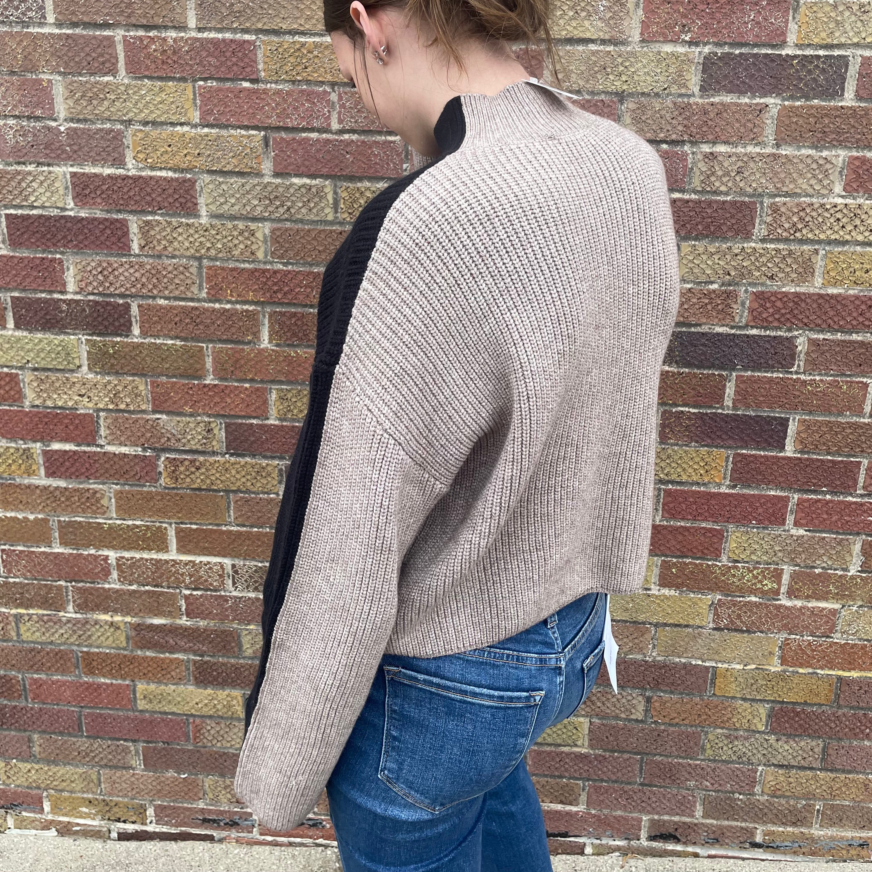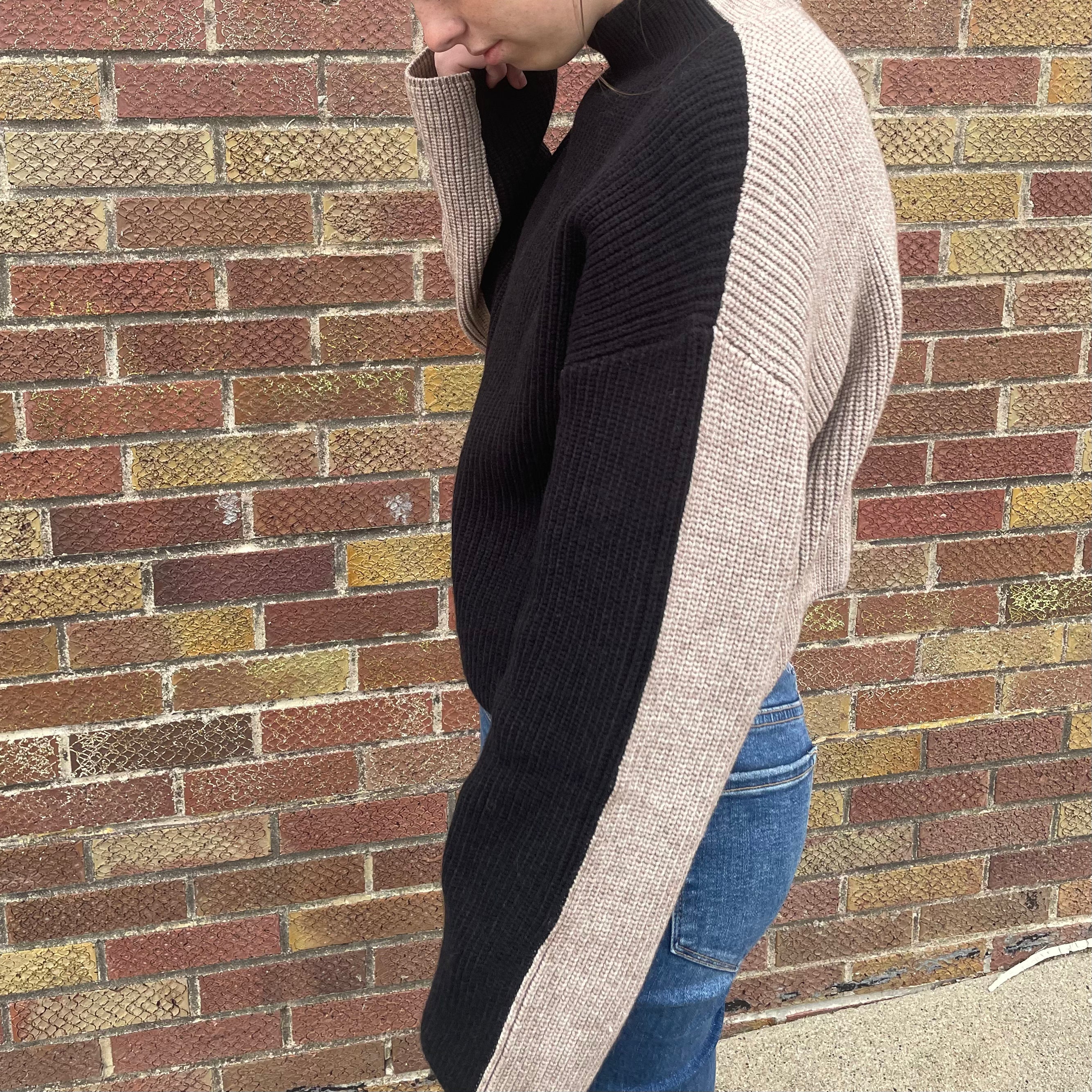 Effortlessly stylish, this Two Tone Turtleneck Sweater in black and taupe is a must-have for any wardrobe. With a flattering drop shoulder and long sleeves, it's the perfect combination of comfort and sophistication. Elevate your look with this versatile and timeless piece.