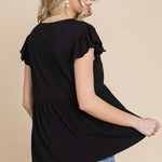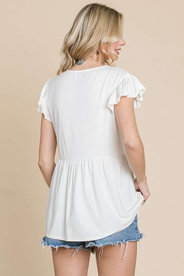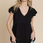 9Elevate your wardrobe with our V-Neck Short Sleeve Top w/Ruching. The elegant flutter sleeves give a feminine touch, while the ruching adds texture and style. Choose from 2 versatile colors to elevate any outfit. Perfect for a stylish and comfortable look.