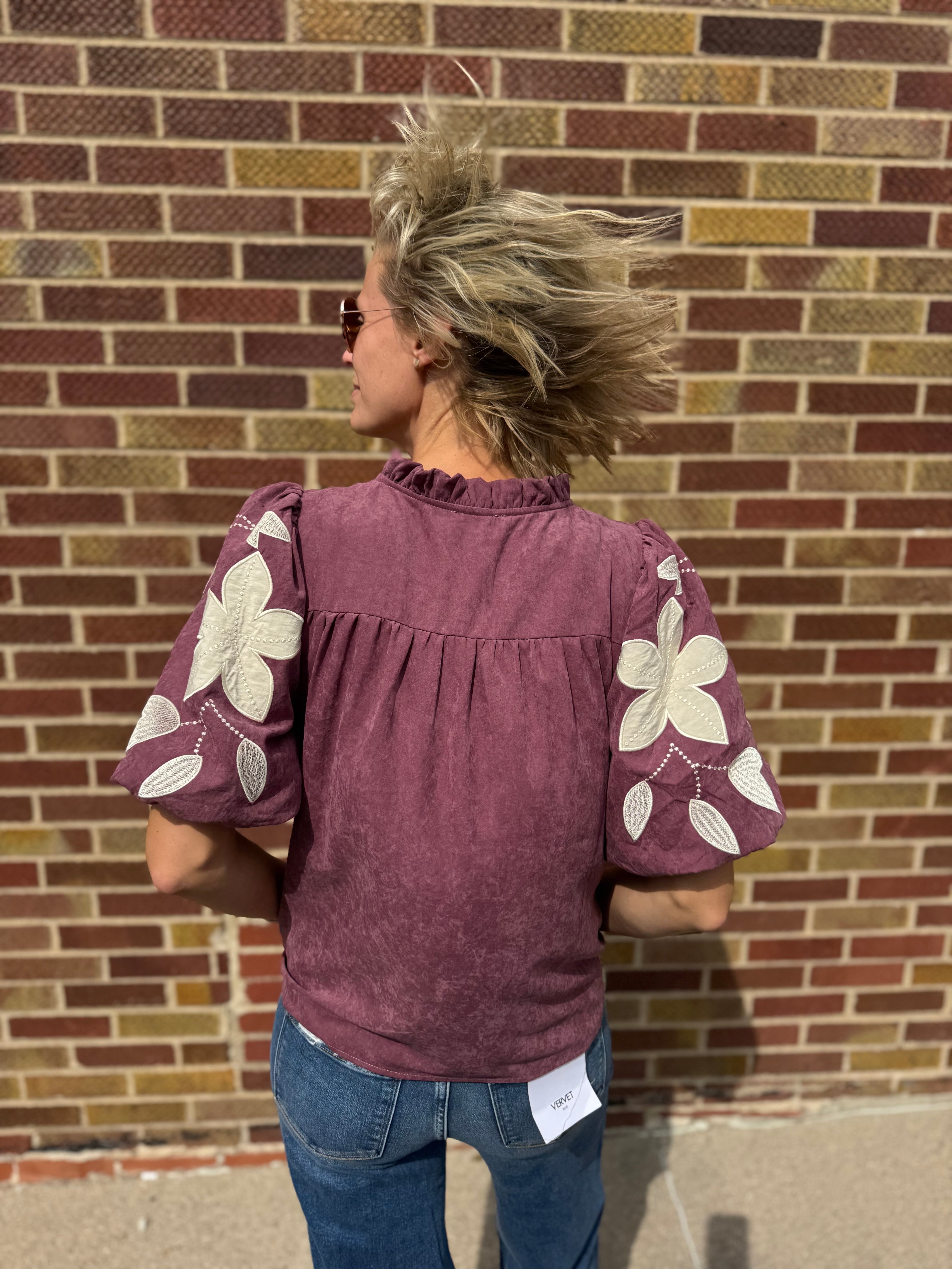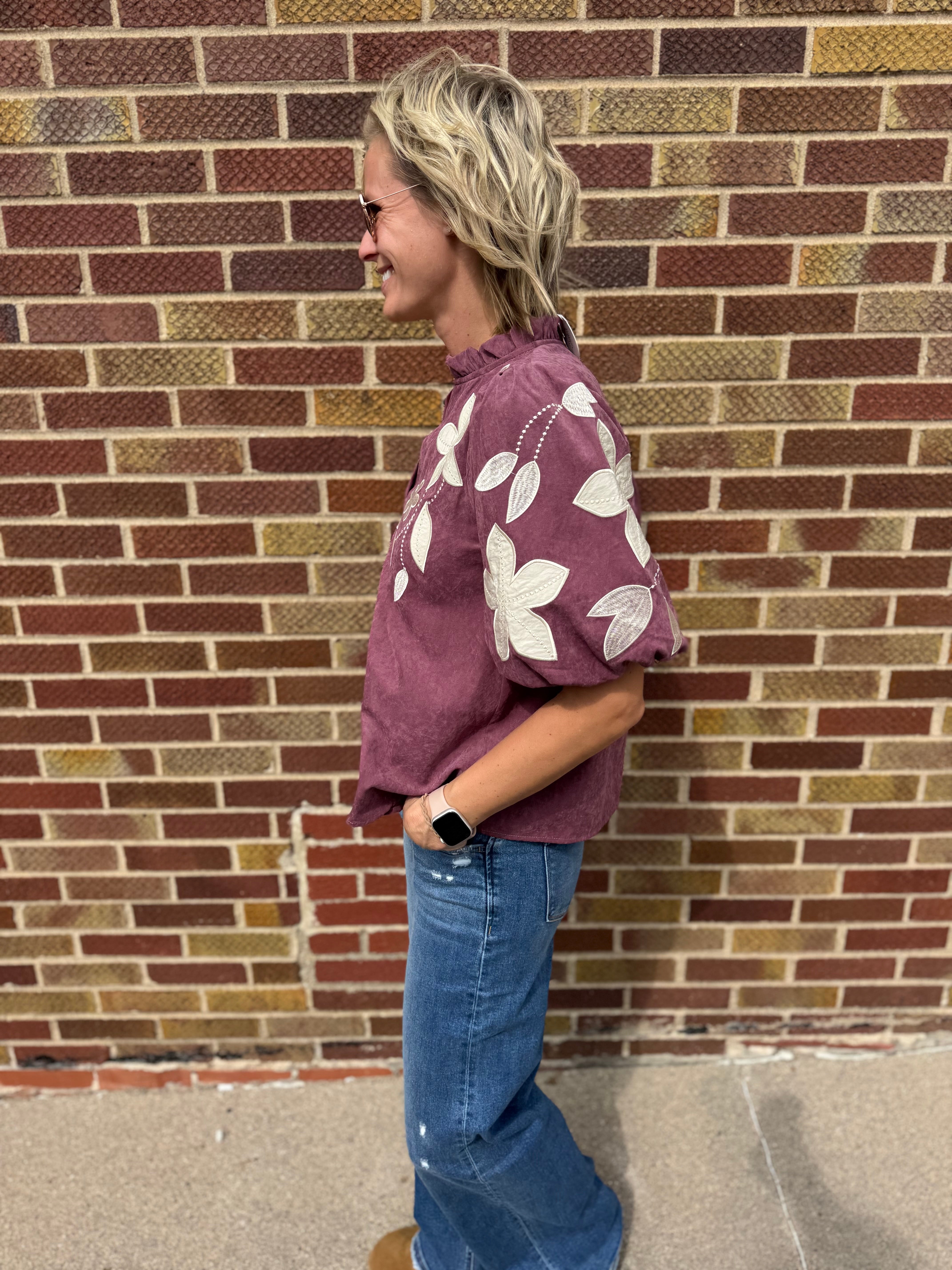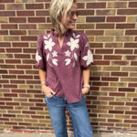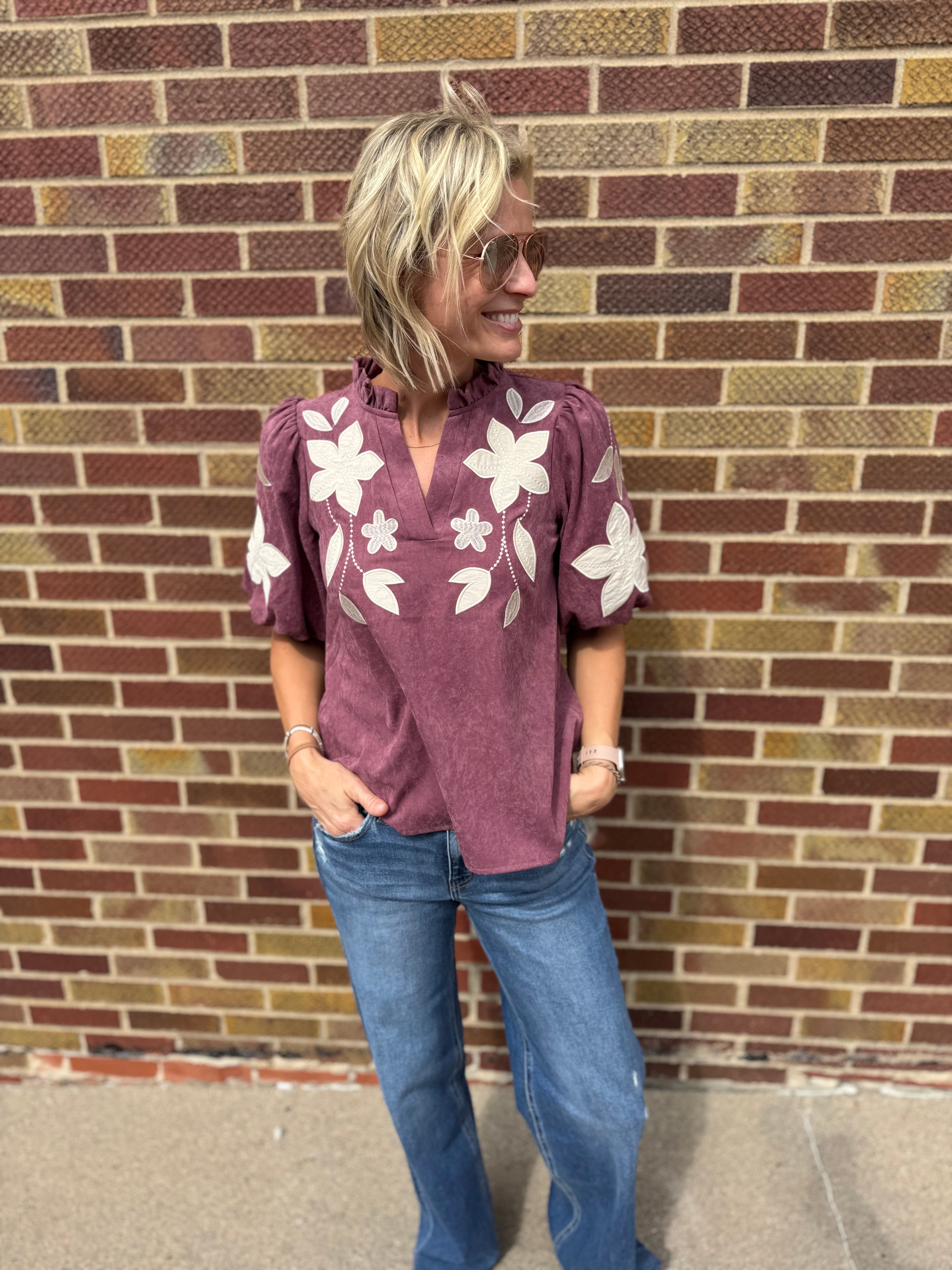 Washed Suede Top w/Floral Applique
