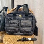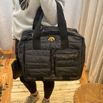 Features: Top zip closure, double exterior pockets, three large interior pockets, zip luggage sleeve, laptop sleeve, detachable premium crossbody strap, clip-on zippered pouch