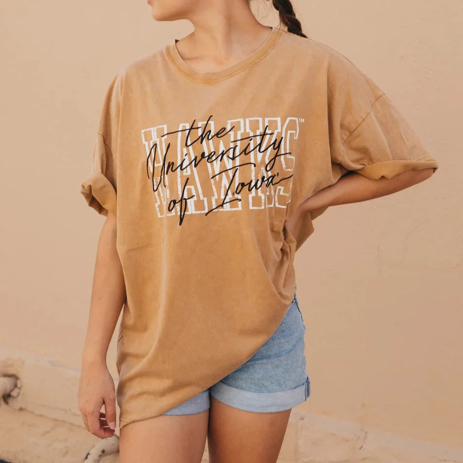 Show your Hawkeye pride with this University of Iowa Owens Oversized Outline Tee. Crafted from Vegas gold fabric, it features "HAWKS" with University of Iowa logo embroidered over it. Represent your school in style with this classic tee.