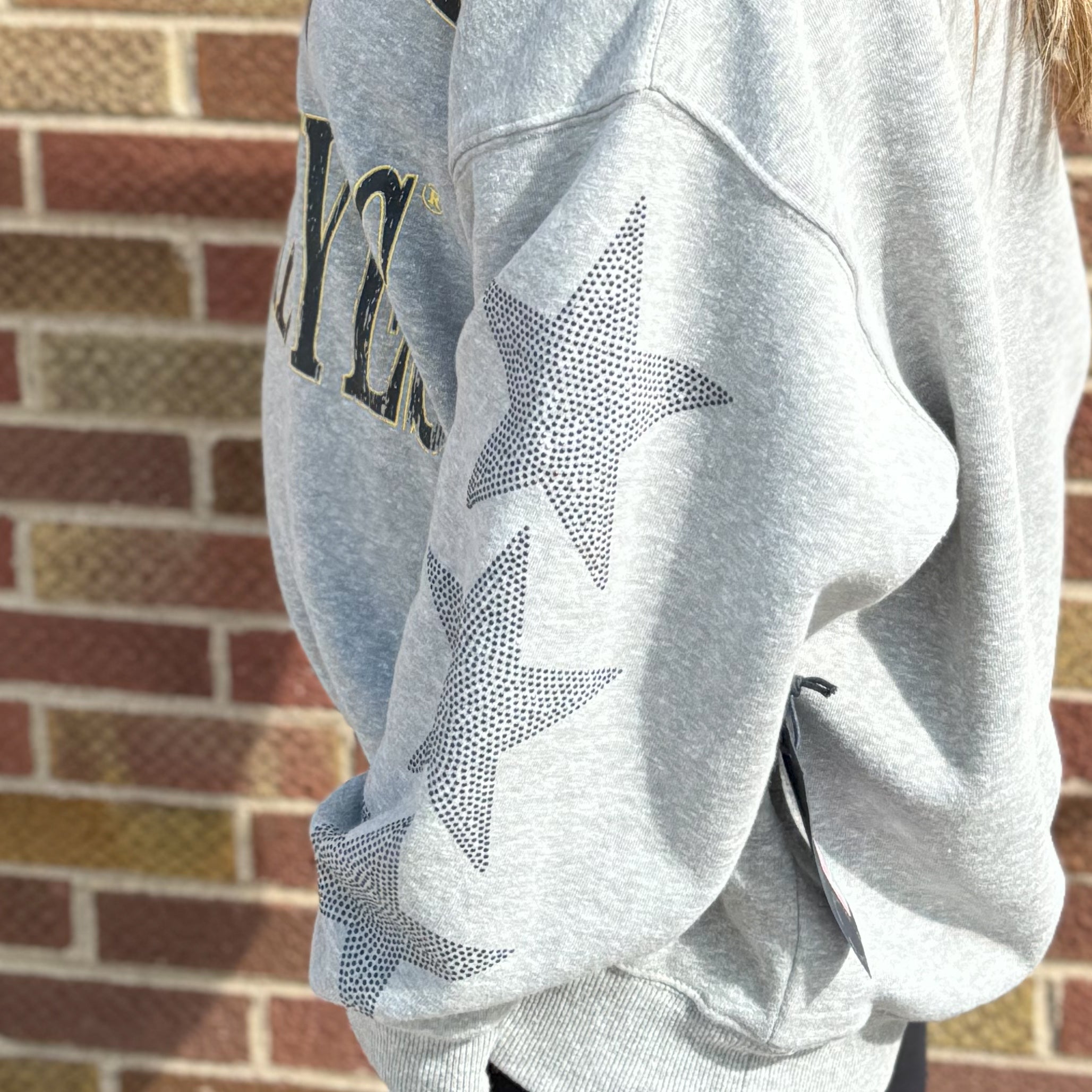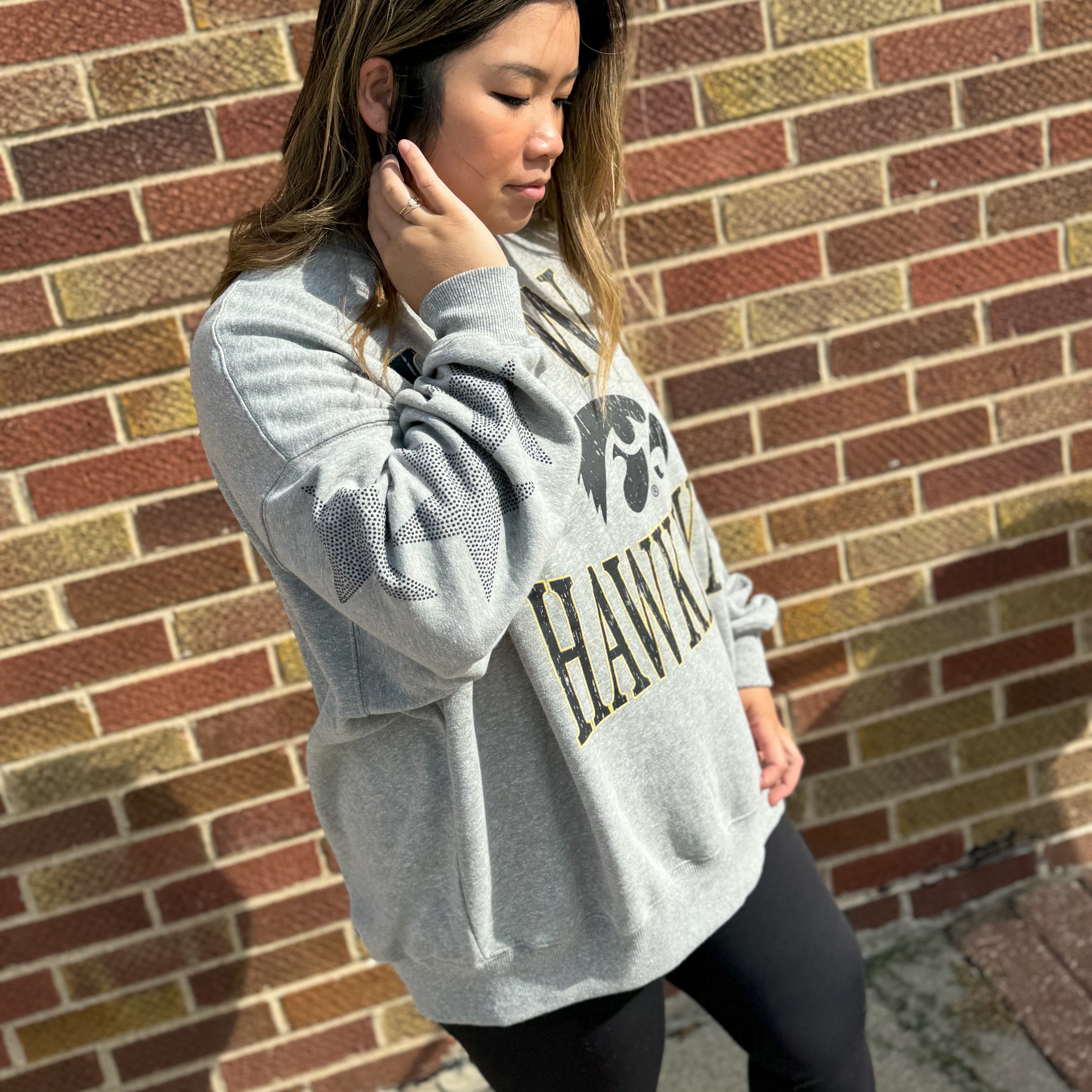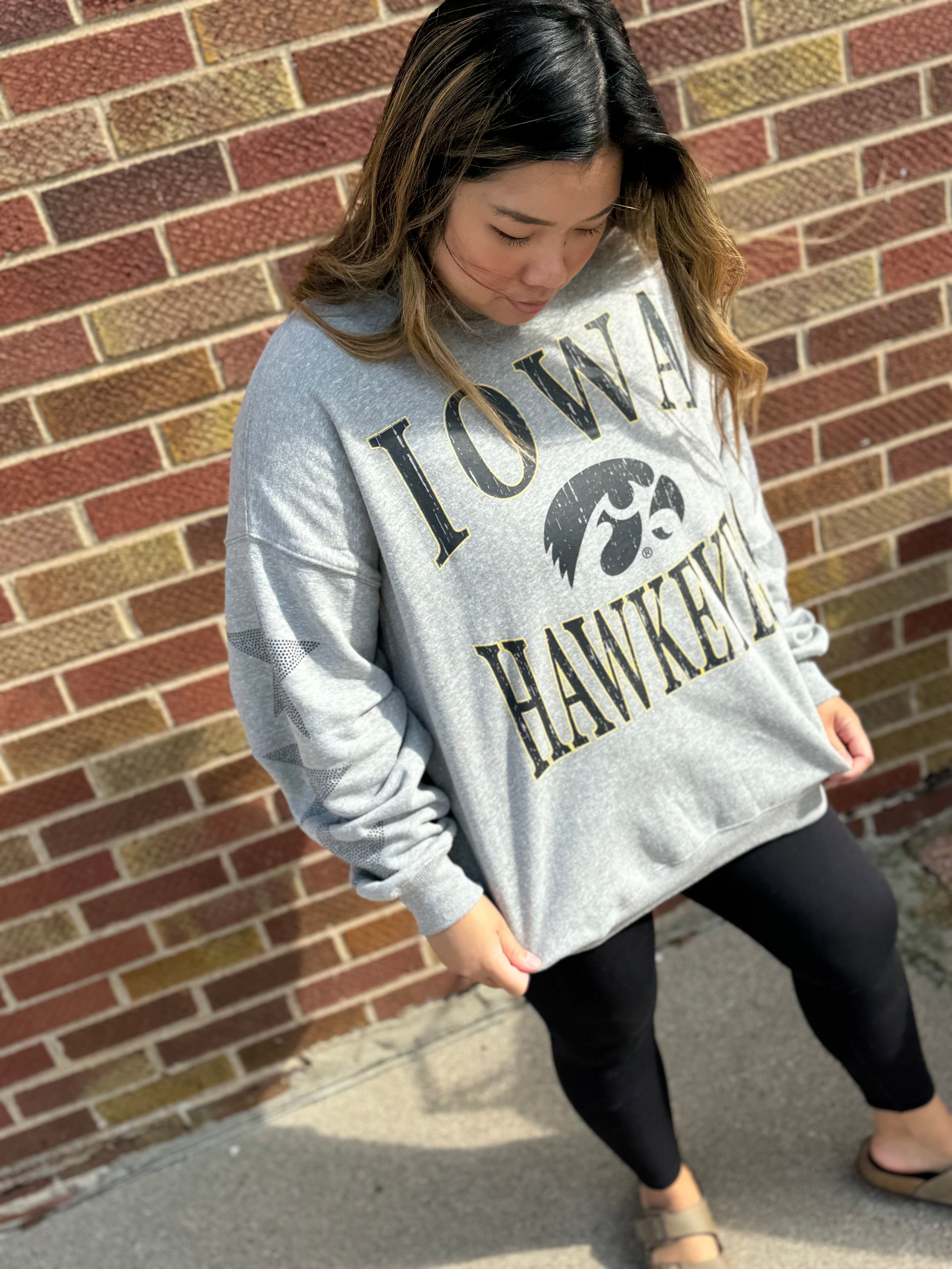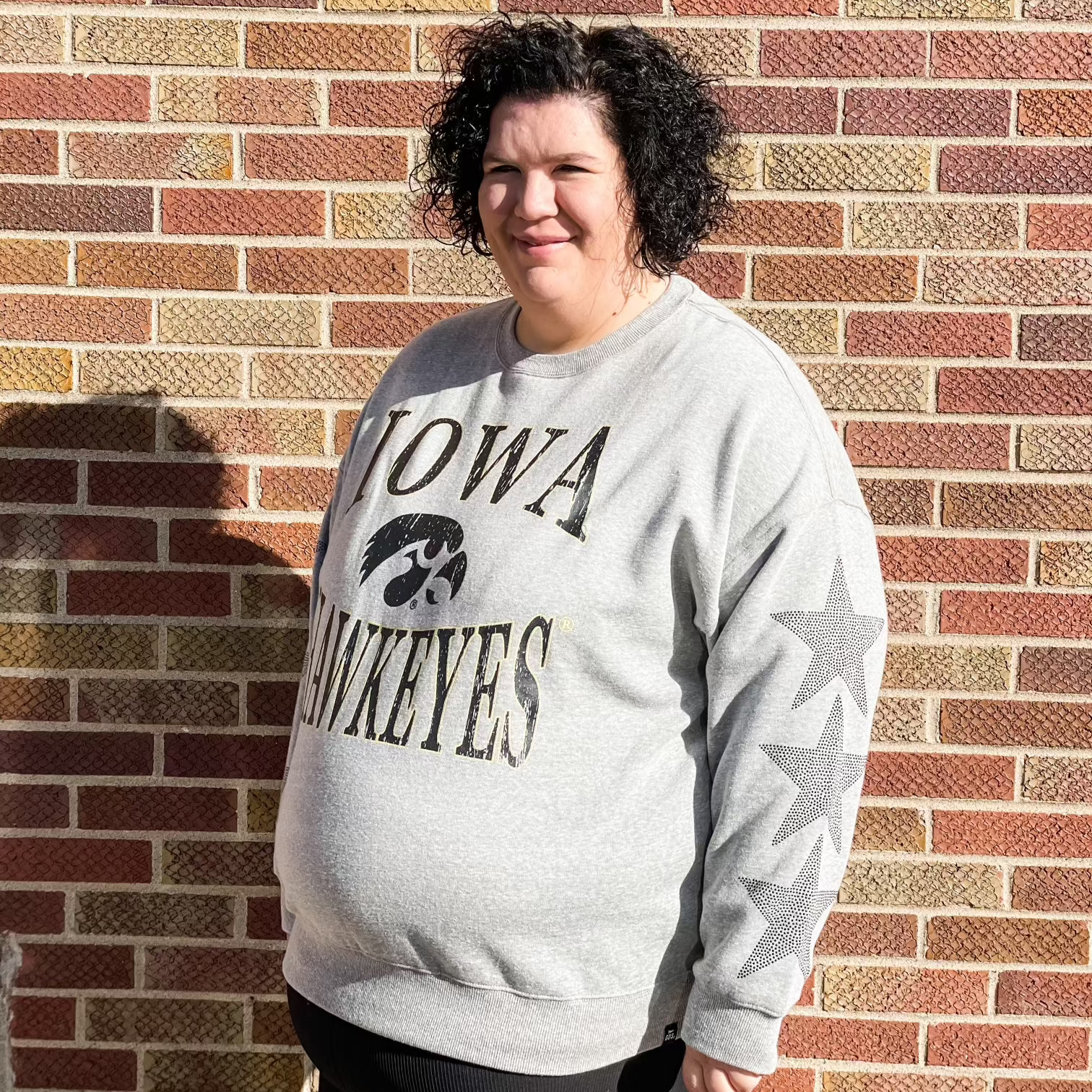 This University of Iowa Wynn Star Sleeve Crewneck is made of heather gray fabric and features a distressed print of the University of Iowa, with three textured stars on both sleeves.