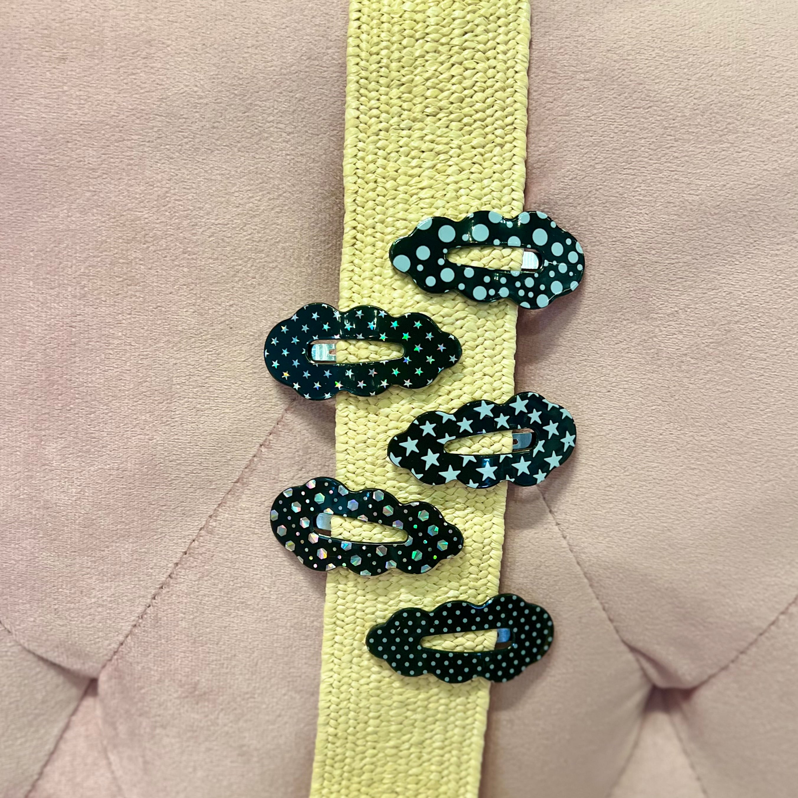 Add a playful touch to your hairstyle with the Black/White Hair Clip, available in five unique patterns: small stars, small polka dots, silver polka dots, big stars, and big polka dots. Each design offers a stylish way to secure your hair while expressing your personality. Perfect for adding charm and flair to any look.