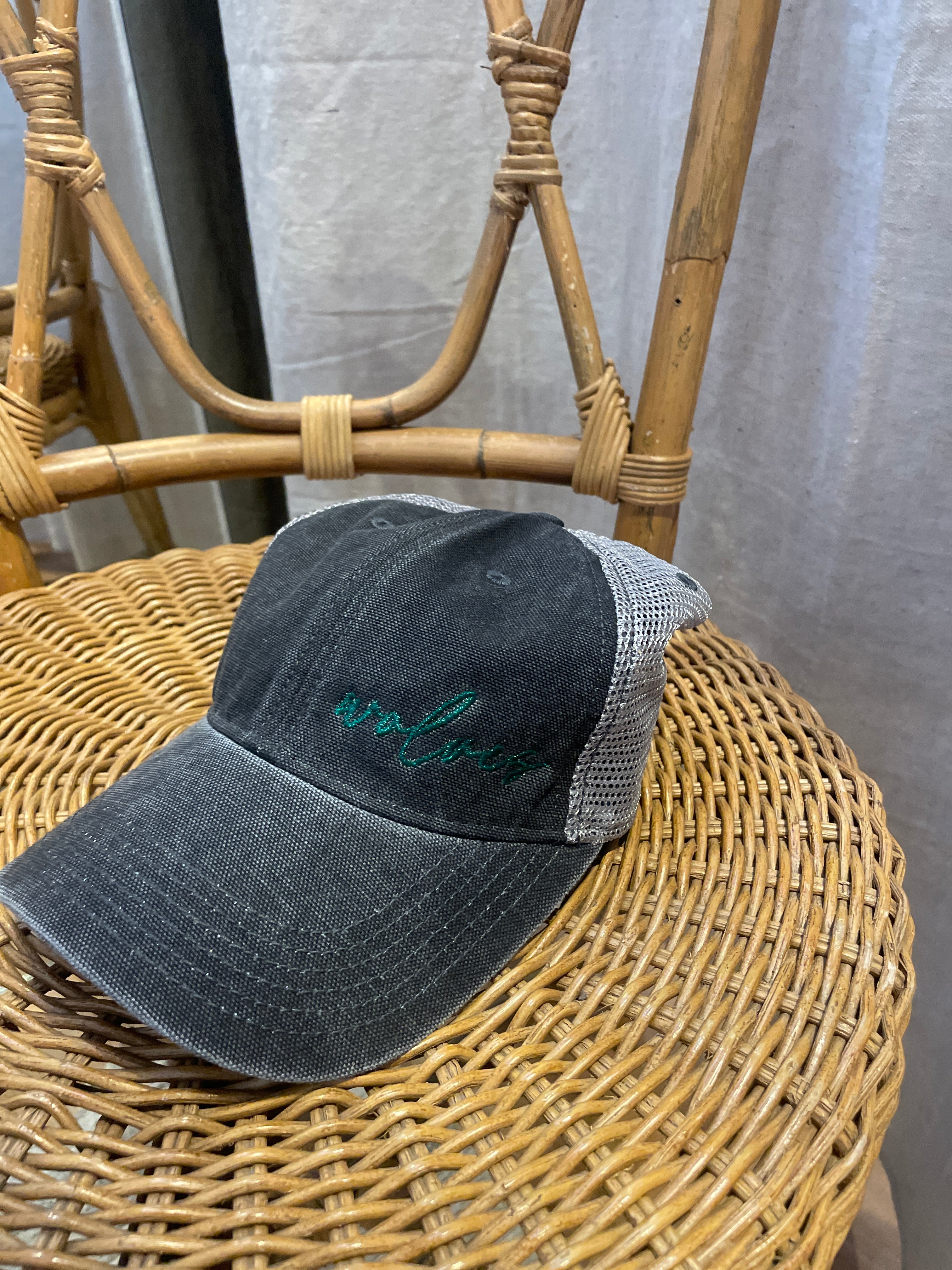Show off your wild side with the Washed Grey Wolves Hat! This comfy, vintage-style cap features playful green embroidered wolves that add a splash of fun to any outfit. Perfect for outdoor adventures or casual hangouts, its washed gray fabric gives it a cool, broken-in look you'll love wearing again and again.