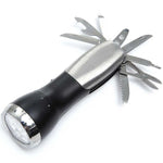 Distinctive Mad Man flash light with several hidden tools in the handle. Great for the man on the go. Includes, scissors, saw blade, knife. Tools include, scissors, saw blade, knife. Stainless steel with matte black contrast. They are ideal men's accessory for home and car. Material: Stainless Steel | Plastic. Dimensions: 6 x 2.5.
