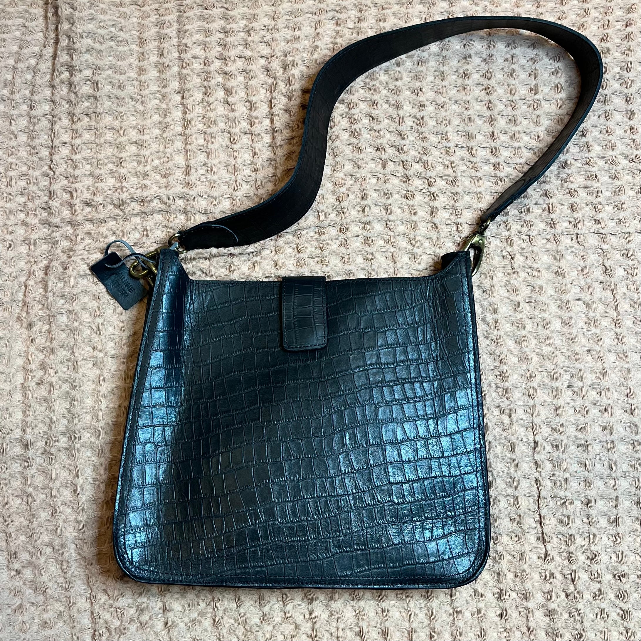 The Allie Purse is crafted from luxurious black snack like leather with a snap closure and two interior pockets for extra storage. An internal zipper pocket provides secure storage for small items. The 2-inch wide shoulder strap ensures comfortable and convenient carrying.