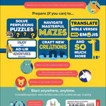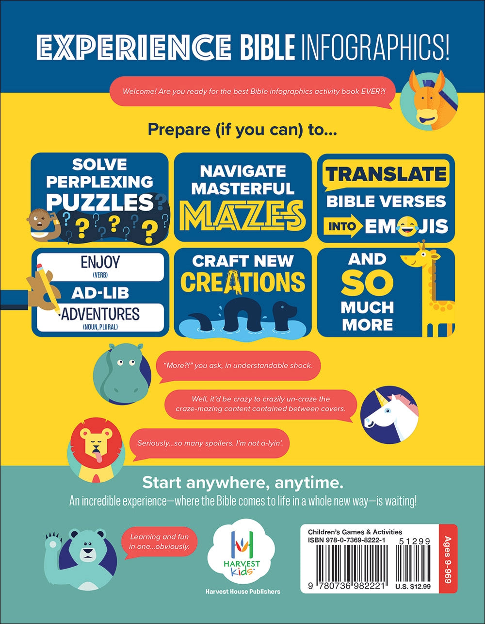Experience Bible infographics! Prepare (if you can) to solve perplexing puzzles, masterfully crafted mazes, translate Bible verses into emojis, muster up ad-libs, craft new creations, doodle, write, search, find, experiment, plus a lot more! "More?!" you ask, in understandable shock. Well, we didn’t want to crazily un-craze the craze-mazing content contained between covers. (seriously…spoilers!) Learning and fun in one! It doesn’t matter where you start. An incredible experience—where the Bible comes to life in a whole new way—is waiting!