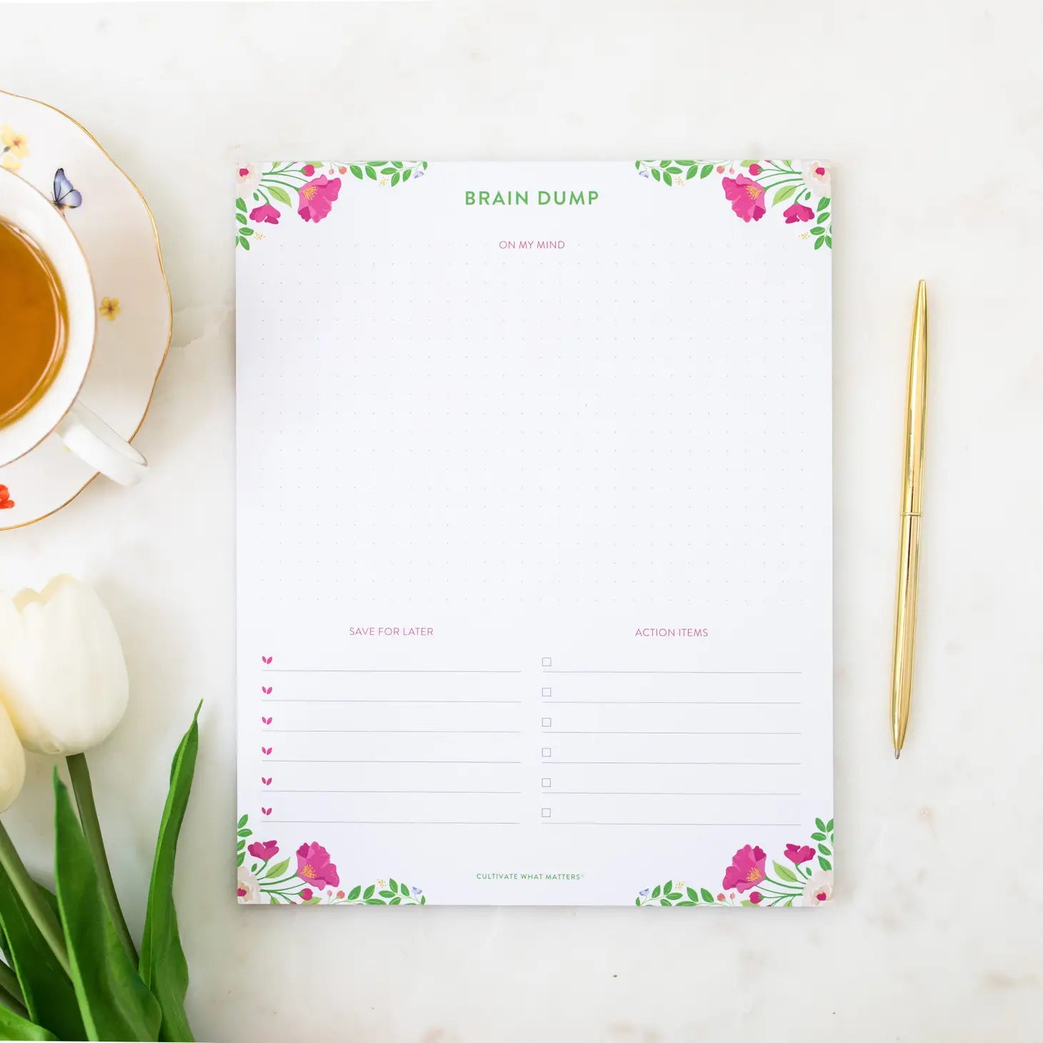 The Brain Dump Planner Notepad is the perfect companion to put all these great ideas, need-to-dos, and action items on paper so that you can effectively organize and prioritize.