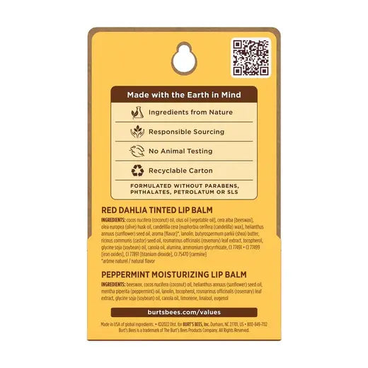 Burt's Bees® Holiday Peppermint Lip Balm and Red Dahlia Tinted Lip Balm gift set gives them two ways to moisturize their lips, one with a hint of color. Peppermint Lip Balm 0.15 oz. and Red Dahlia Tinted Lip Balm 0.15 oz.