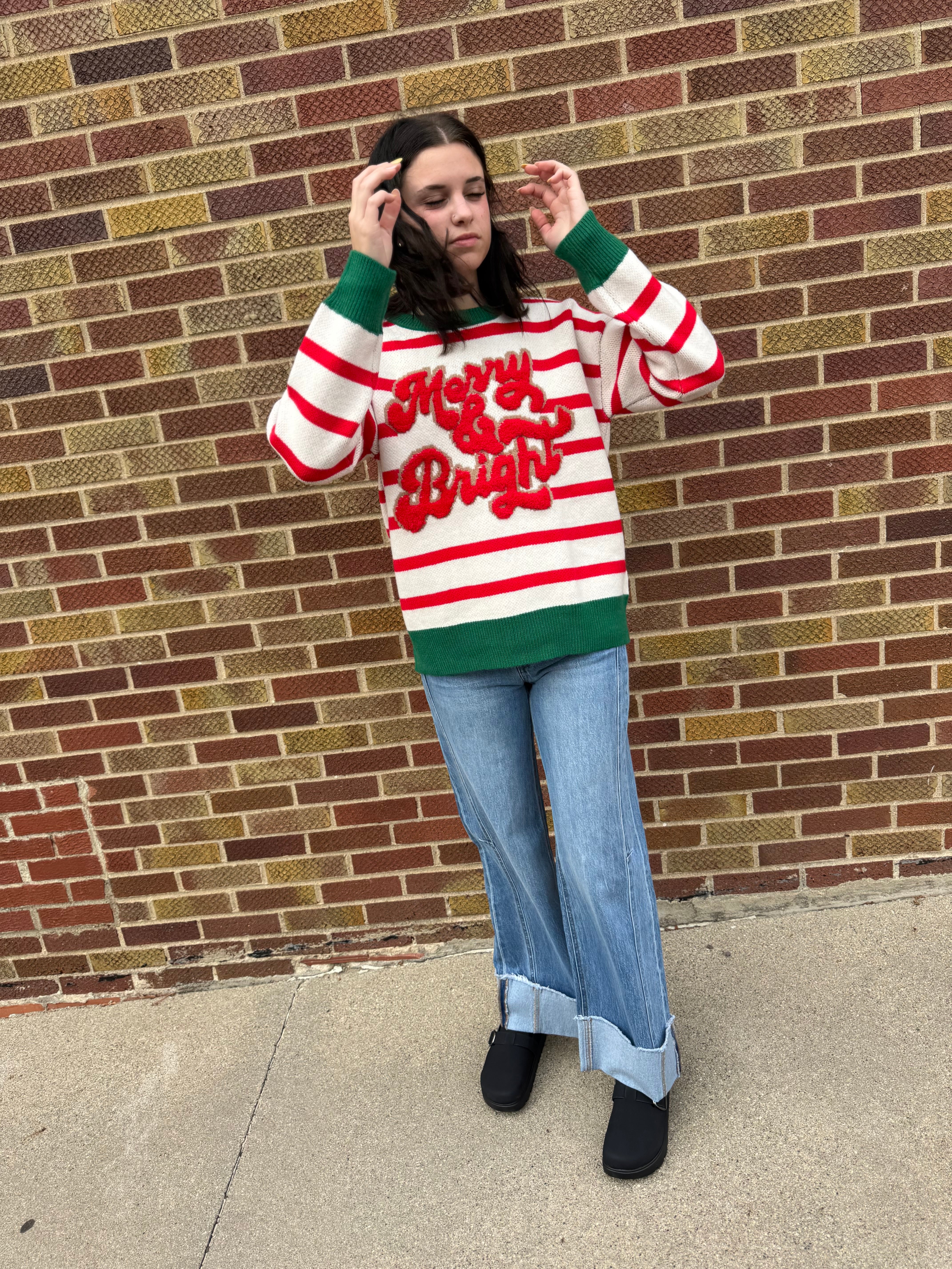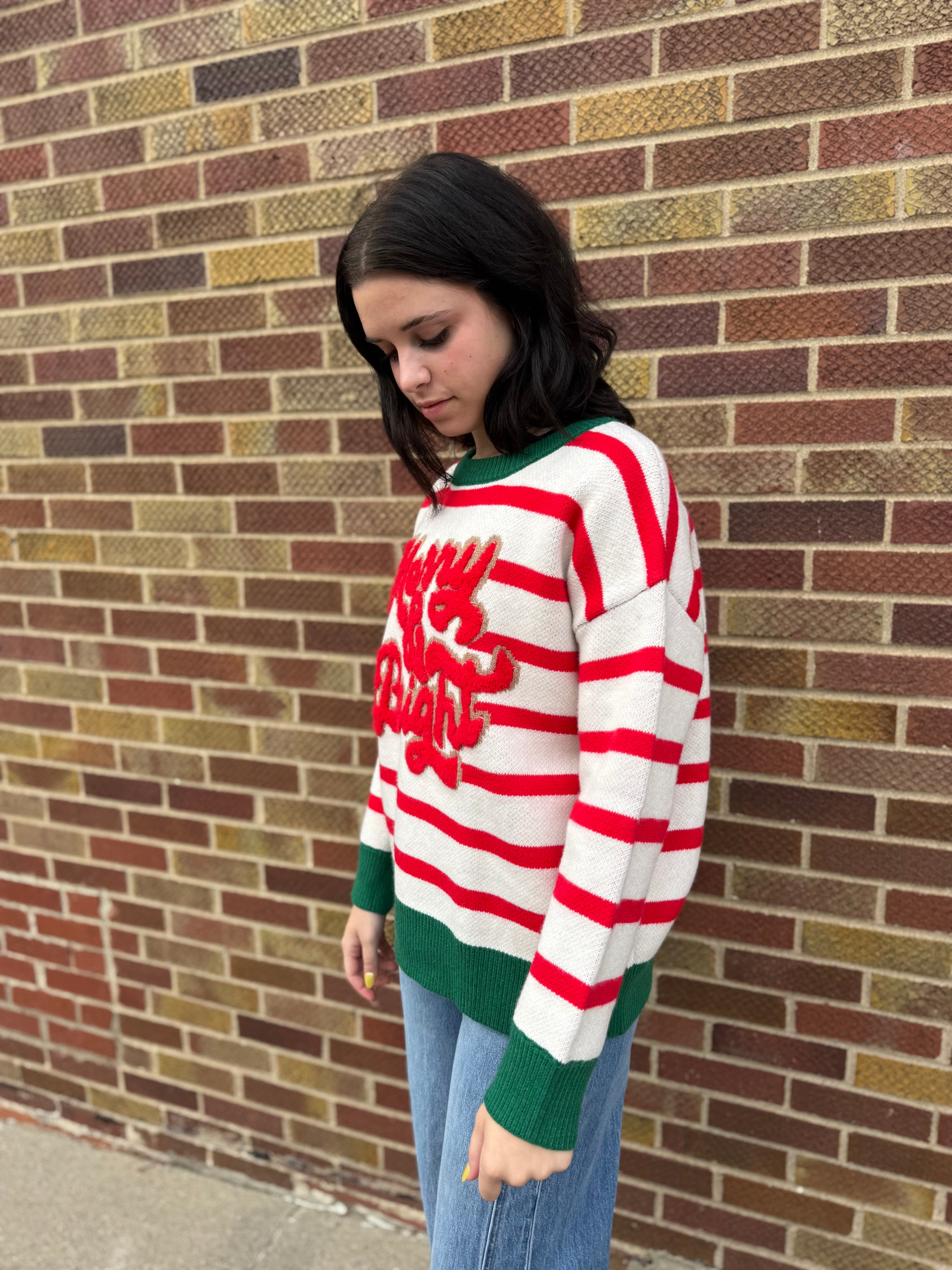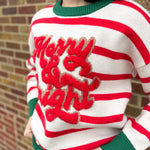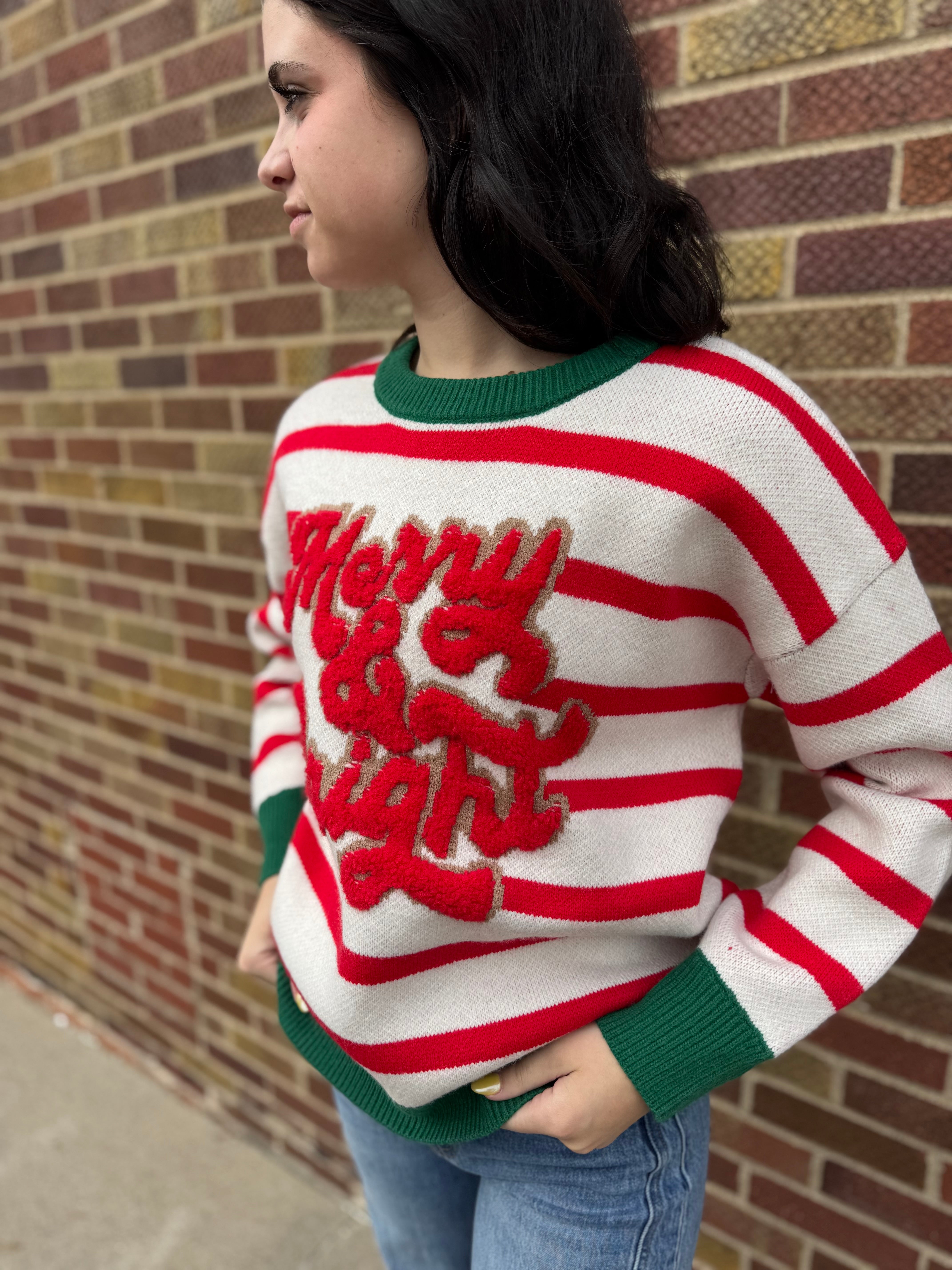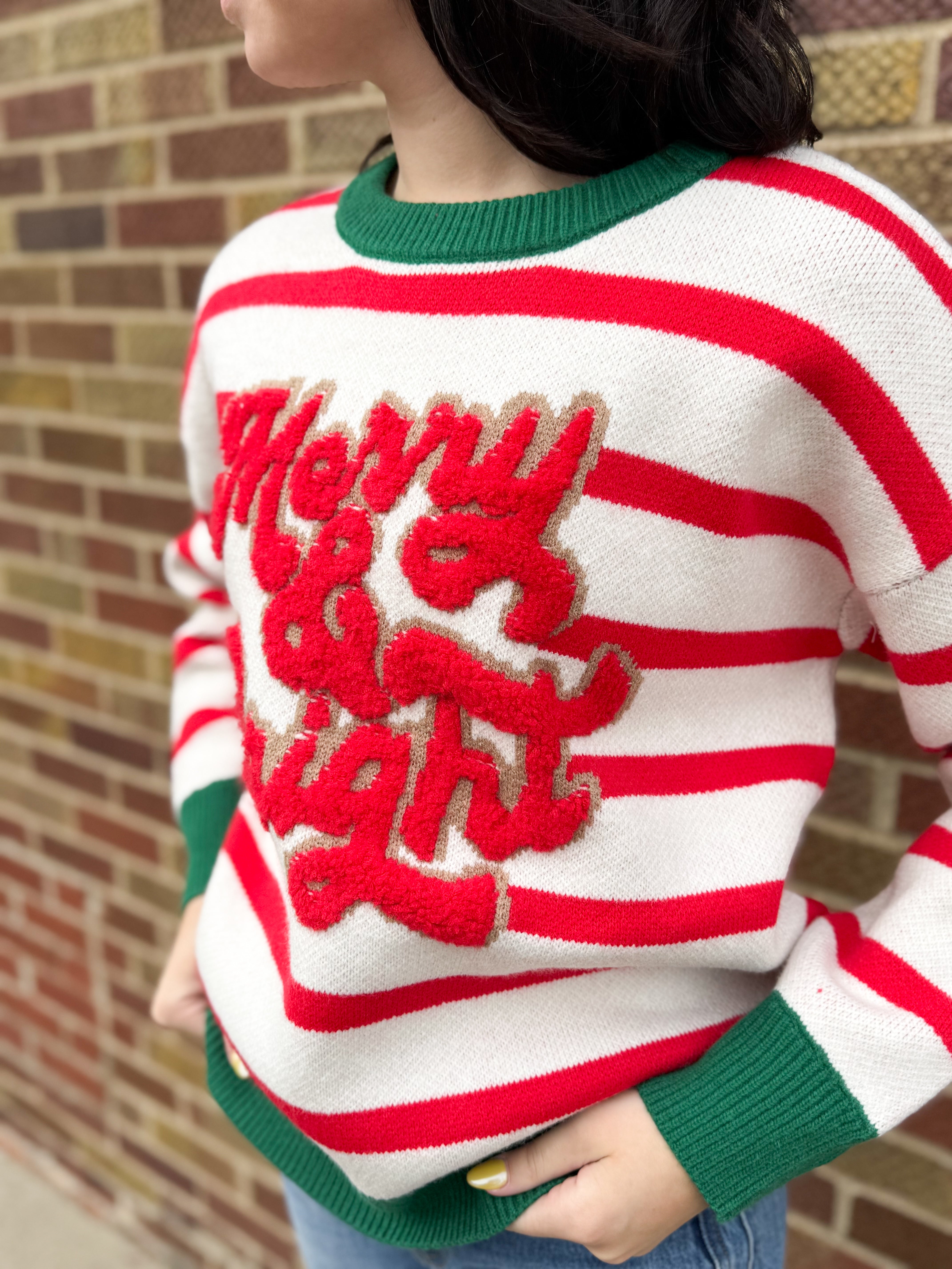 Celebrate the season in style with this playful Christmas Theme Stripe Knit Top. Featuring vibrant stripes and the cheerful "merry & bright" slogan, it’s perfect for spreading holiday joy wherever you go. Cozy and fun, it brightens up any festive occasion with a touch of whimsy!