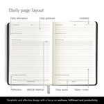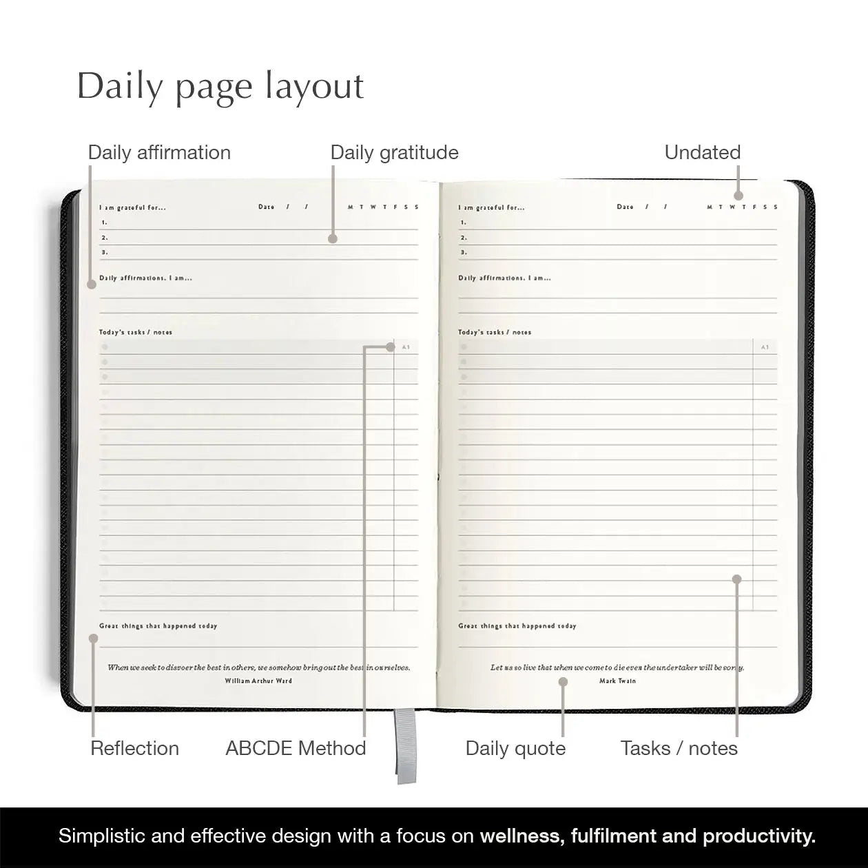 A unique mindfulness gift that helps identify goals and structure your time. Each daily diary schedule page has an area for daily affirmations, daily gratitude, goal setting, to do list, and reflection. Includes weekly planner and monthly planner pages.