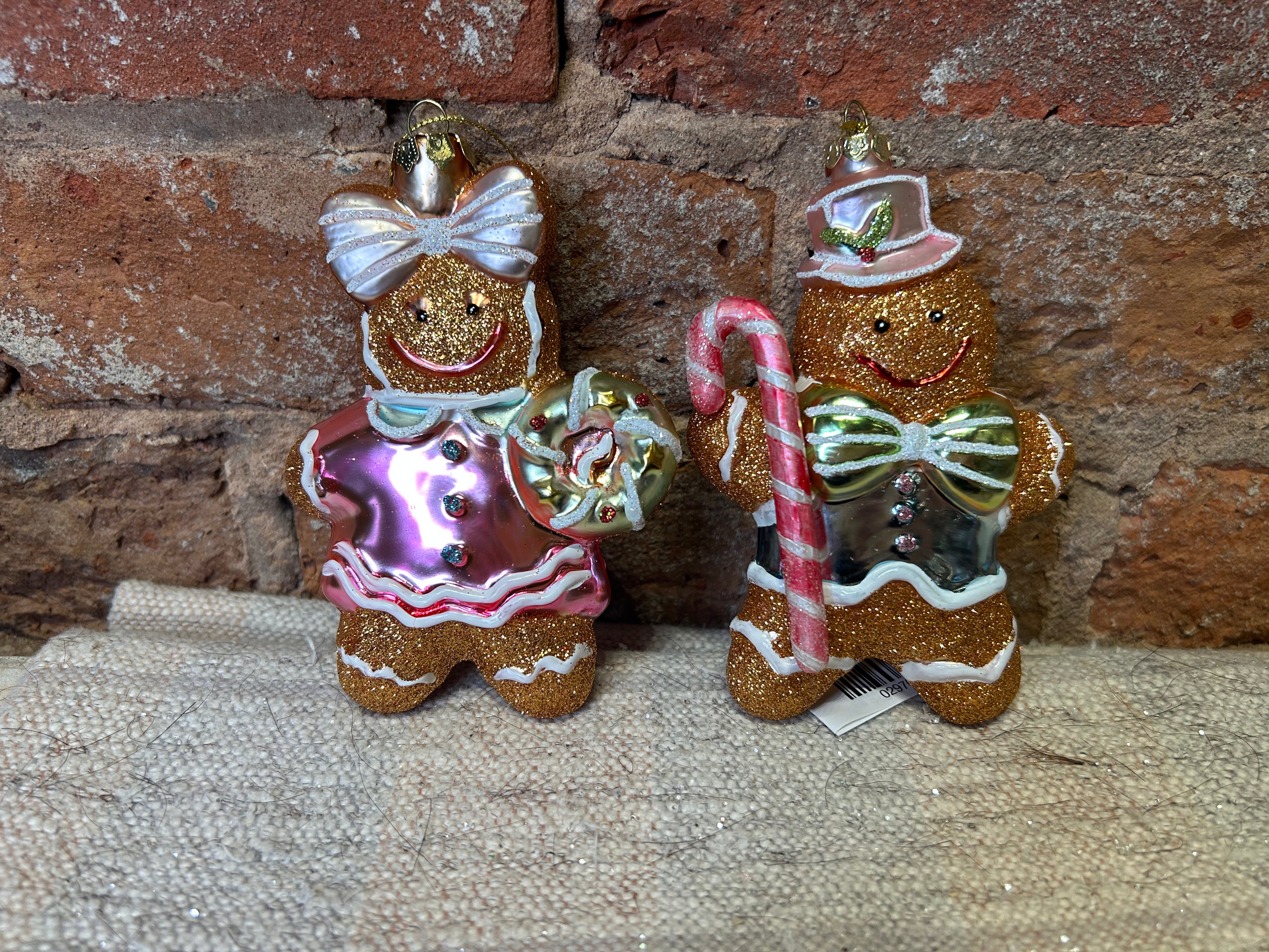 Add a touch of sparkle to your holiday decor with this playful Fancy Glass Gingerbread Couple Ornament set. One gingerbread wears a blue shirt, hat, bow tie, and holds a candy cane, while the other sports a pink dress with a head bow and a donut. Each 5” ornament shines with glittery charm, bringing festive fun and whimsy to your tree.