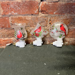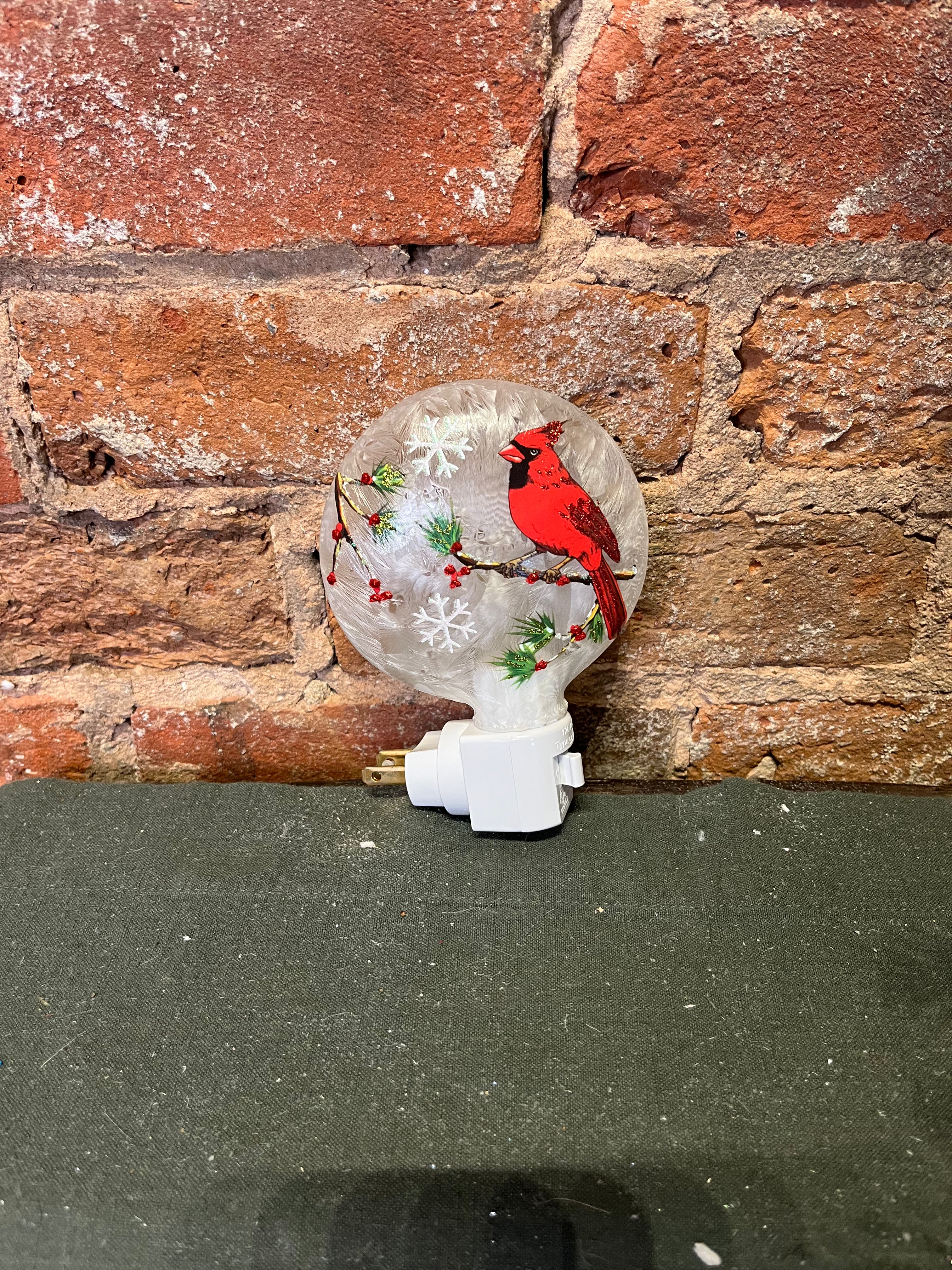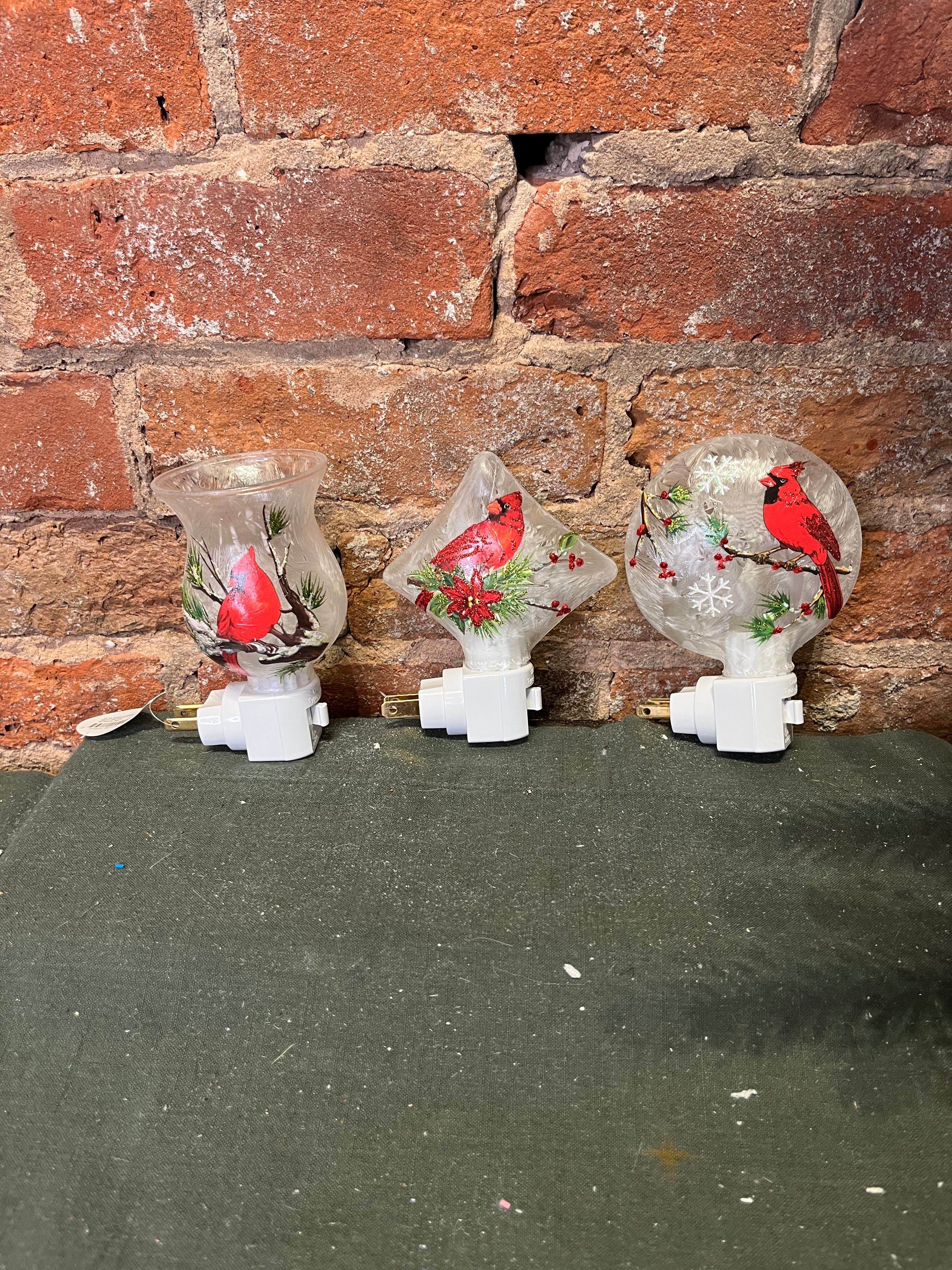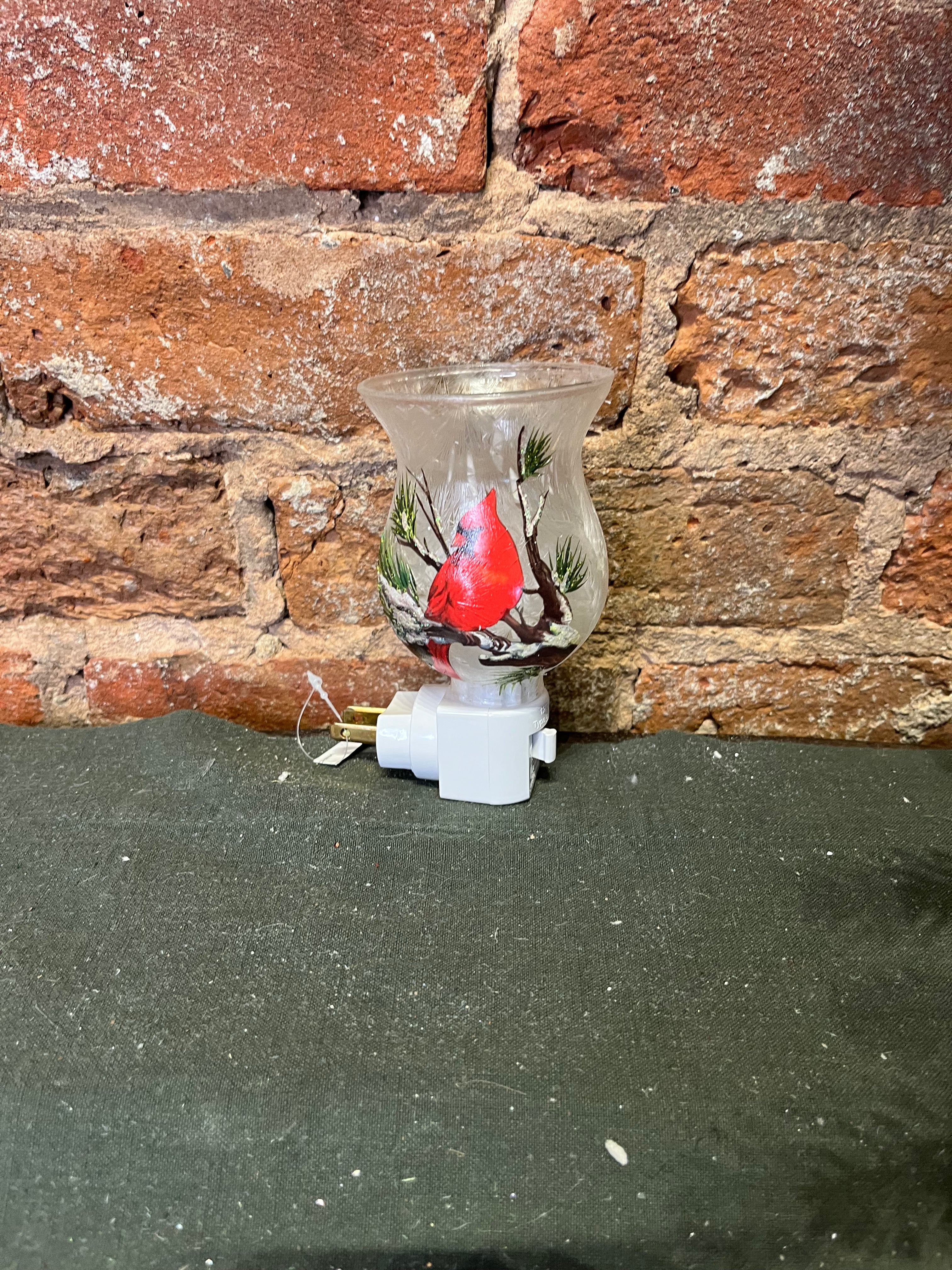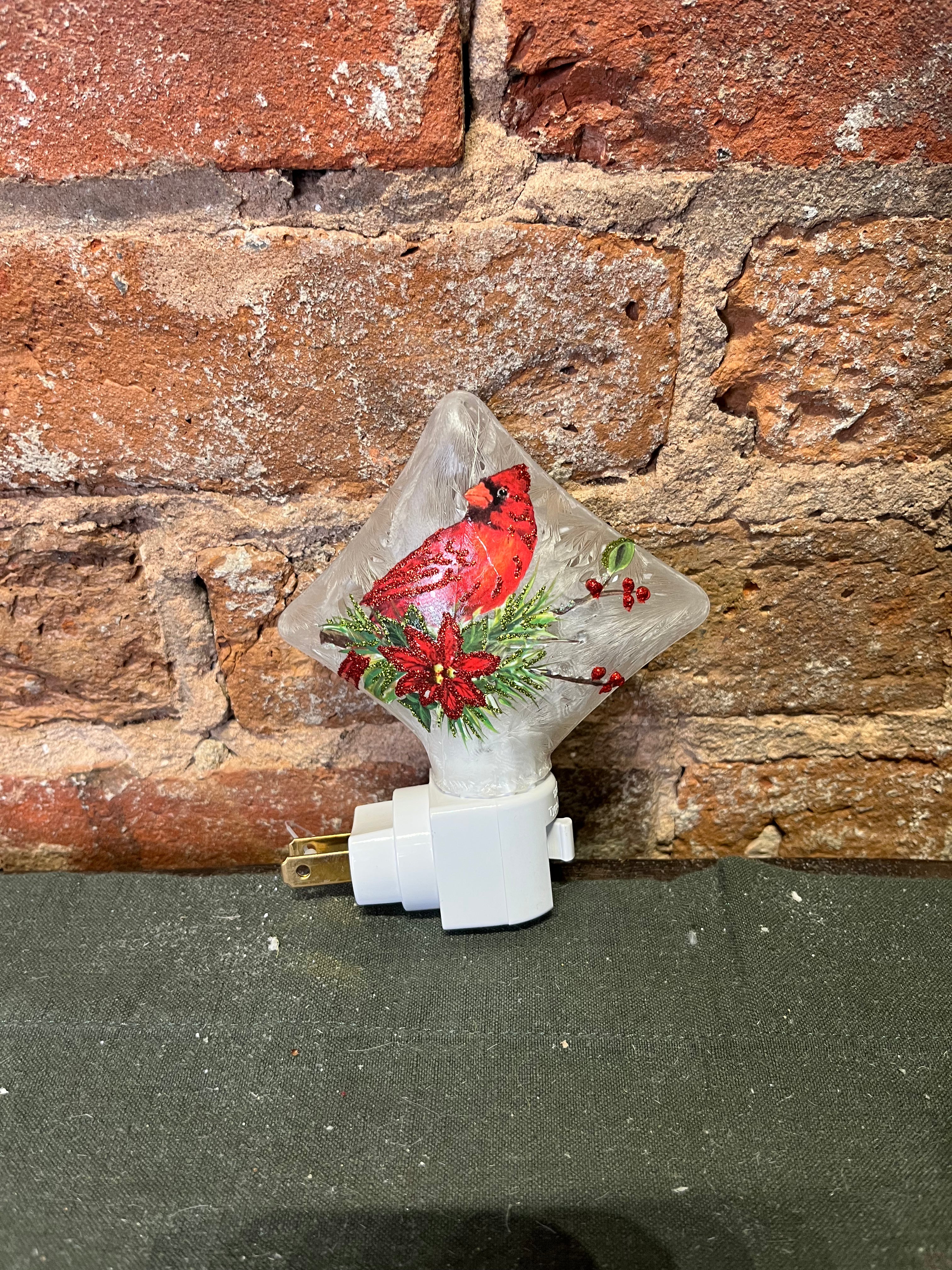 Bring a whimsical glow to your room with this 5.5” Glass Cardinal Night Light. Featuring three different frosted glass cardinals, each uniquely designed, it adds charming warmth and soft light to any space. Perfect for bird lovers, this playful night light brightens bedtime with a cozy, nature-inspired touch.