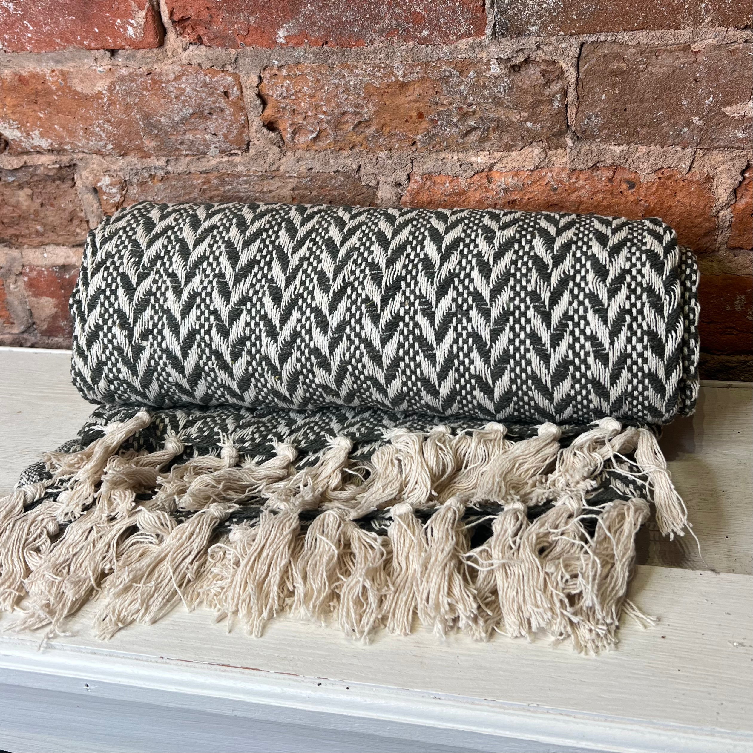 The subtle herringbone pattern in natural and green tones adds refined texture, while the fringe detailing enhances its artisanal quality.