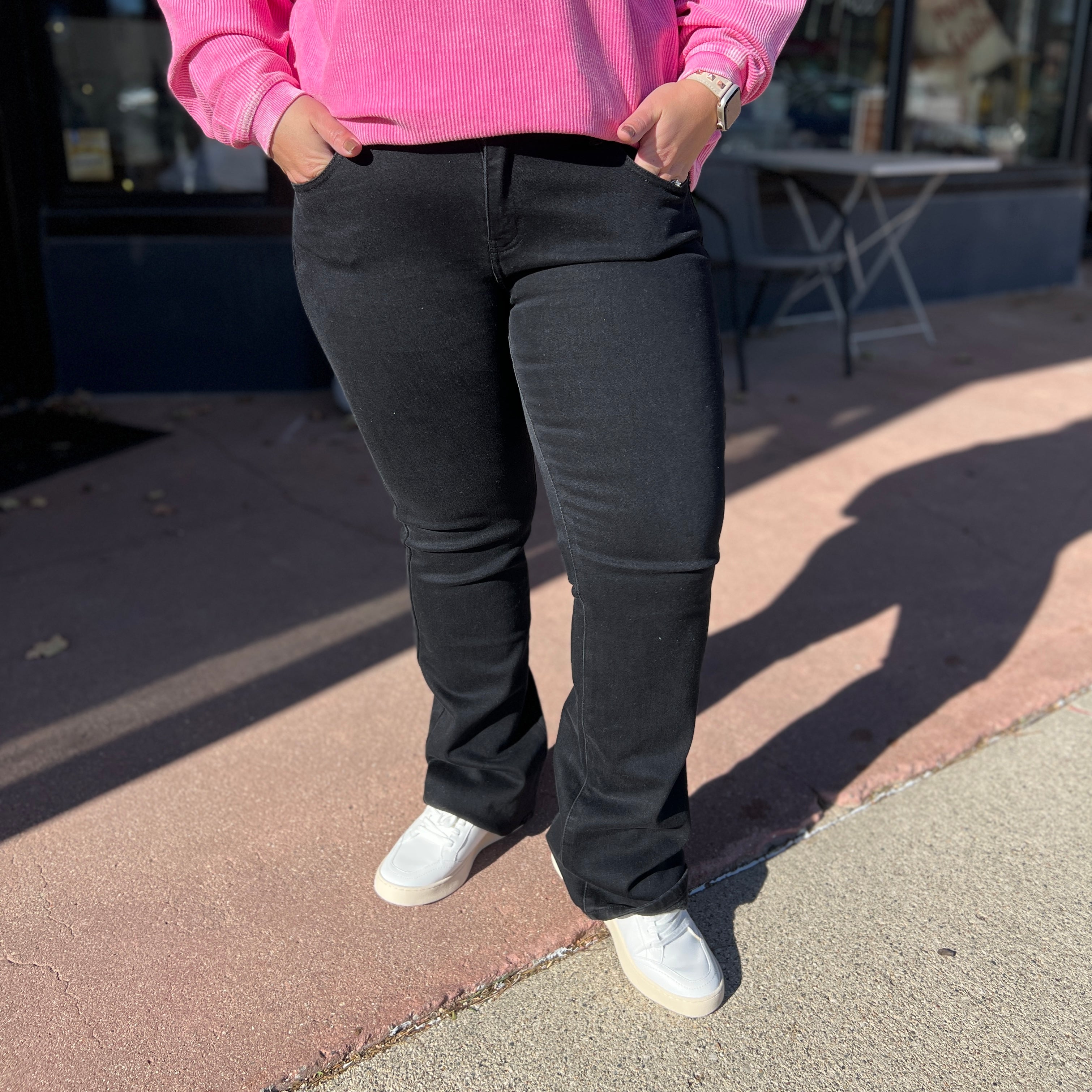 These Juniper Midrise Baby Bootcut Kancan Jeans exude classic sophistication with their timeless black hue and classic bootcut silhouette. The midrise fits comfortably and hugs curves in all the right places. With the perfect mix of style and comfort, these jeans are the perfect addition to any wardrobe. Thermal Lined with fleece.