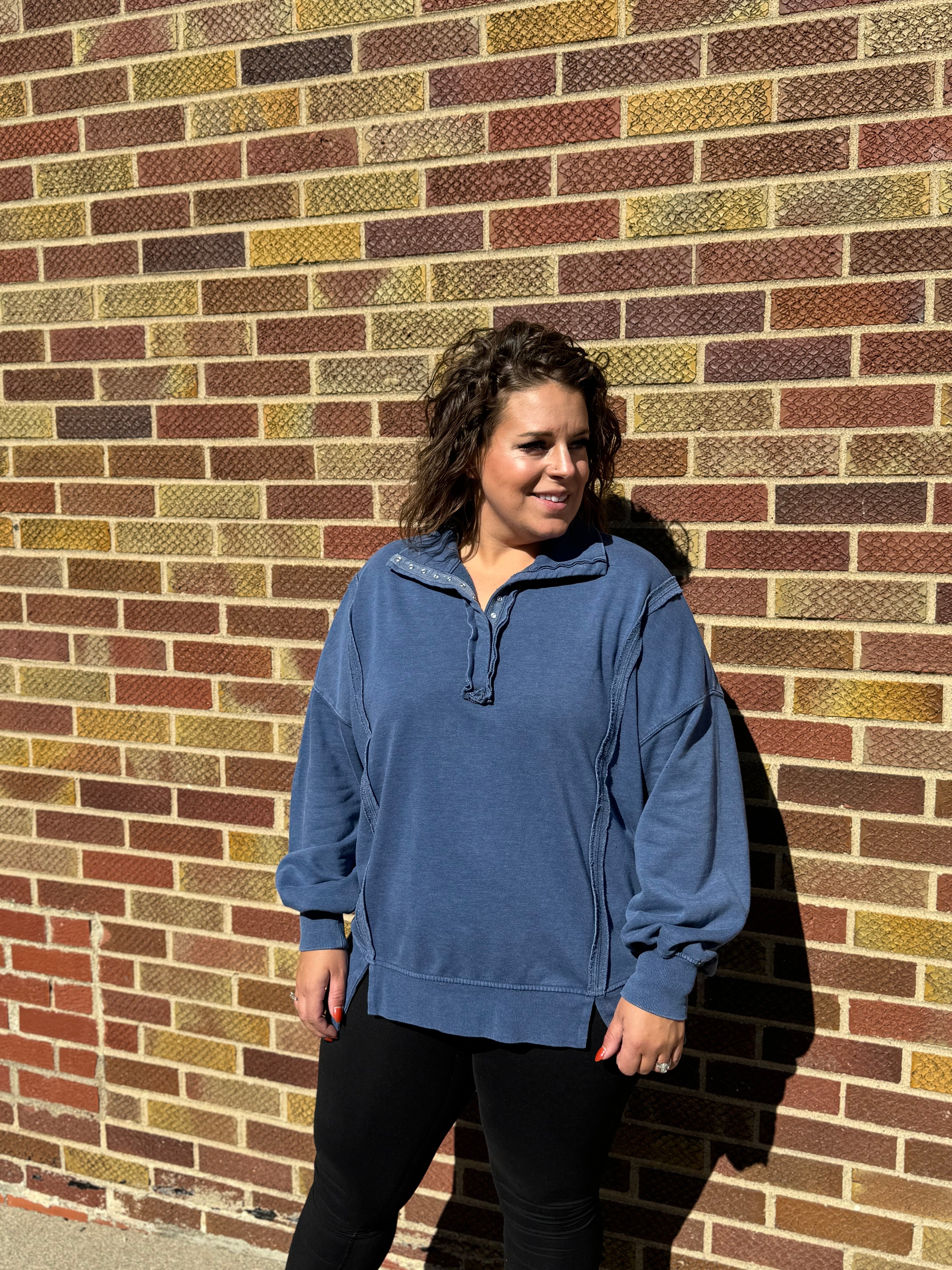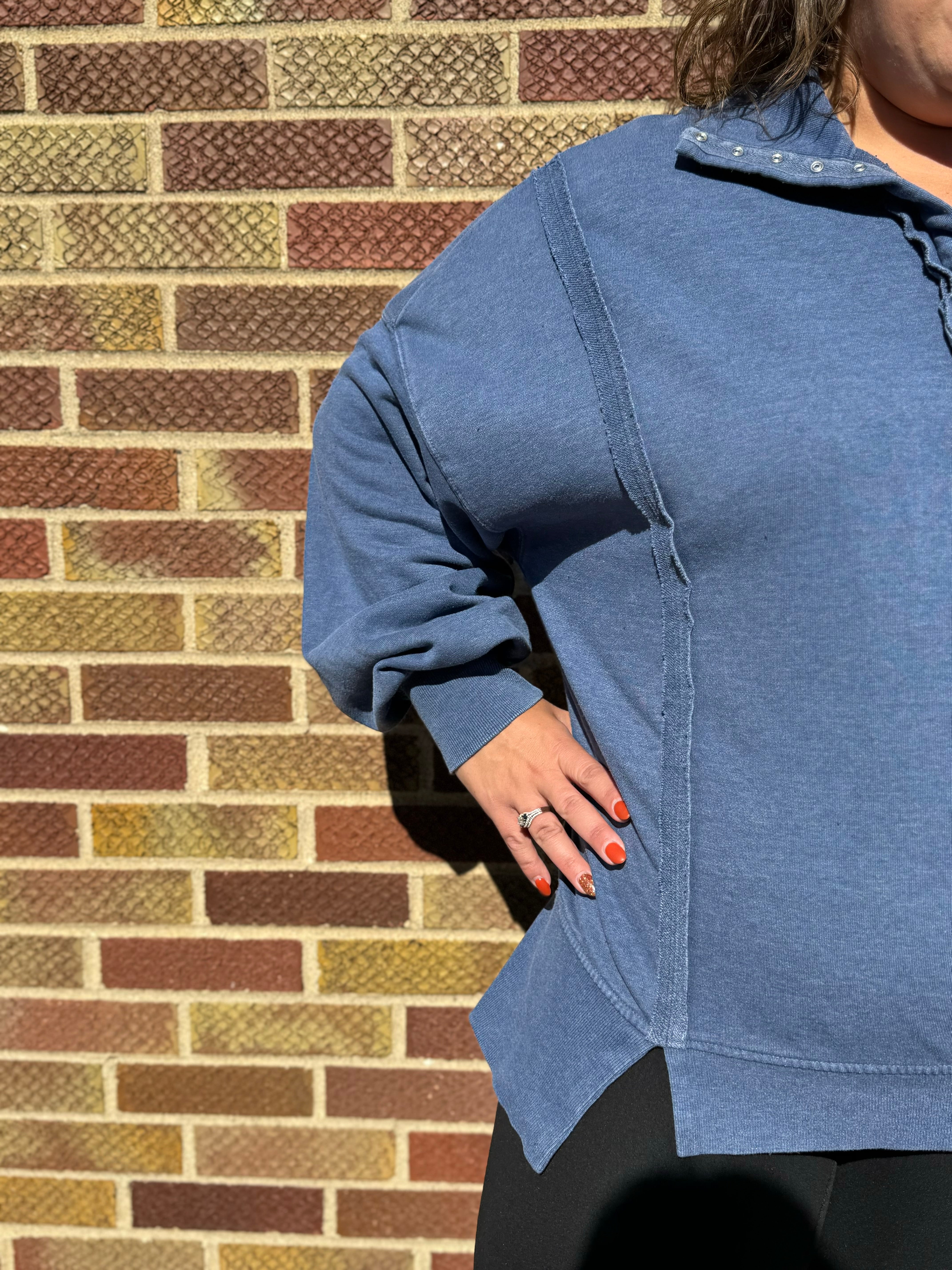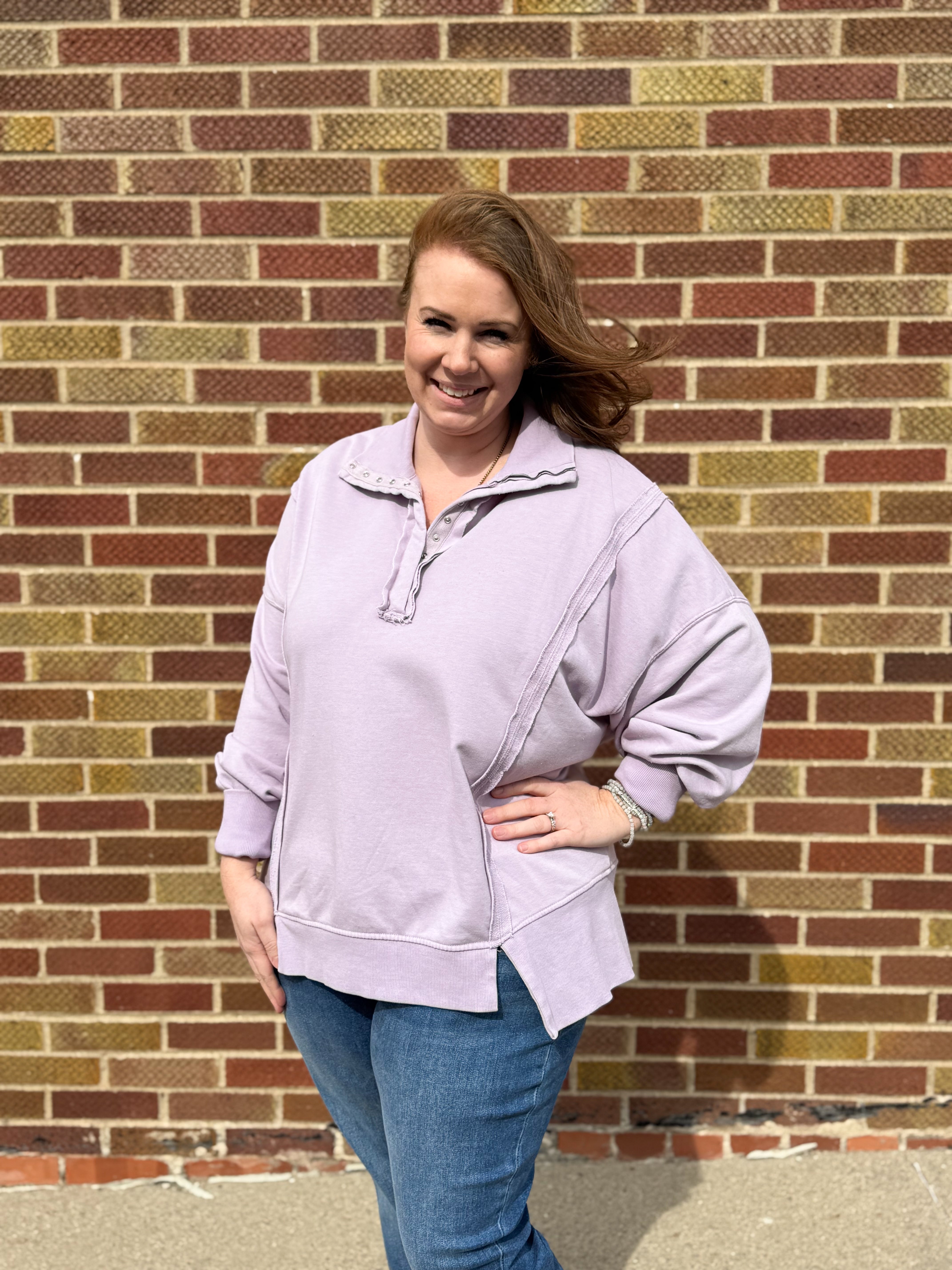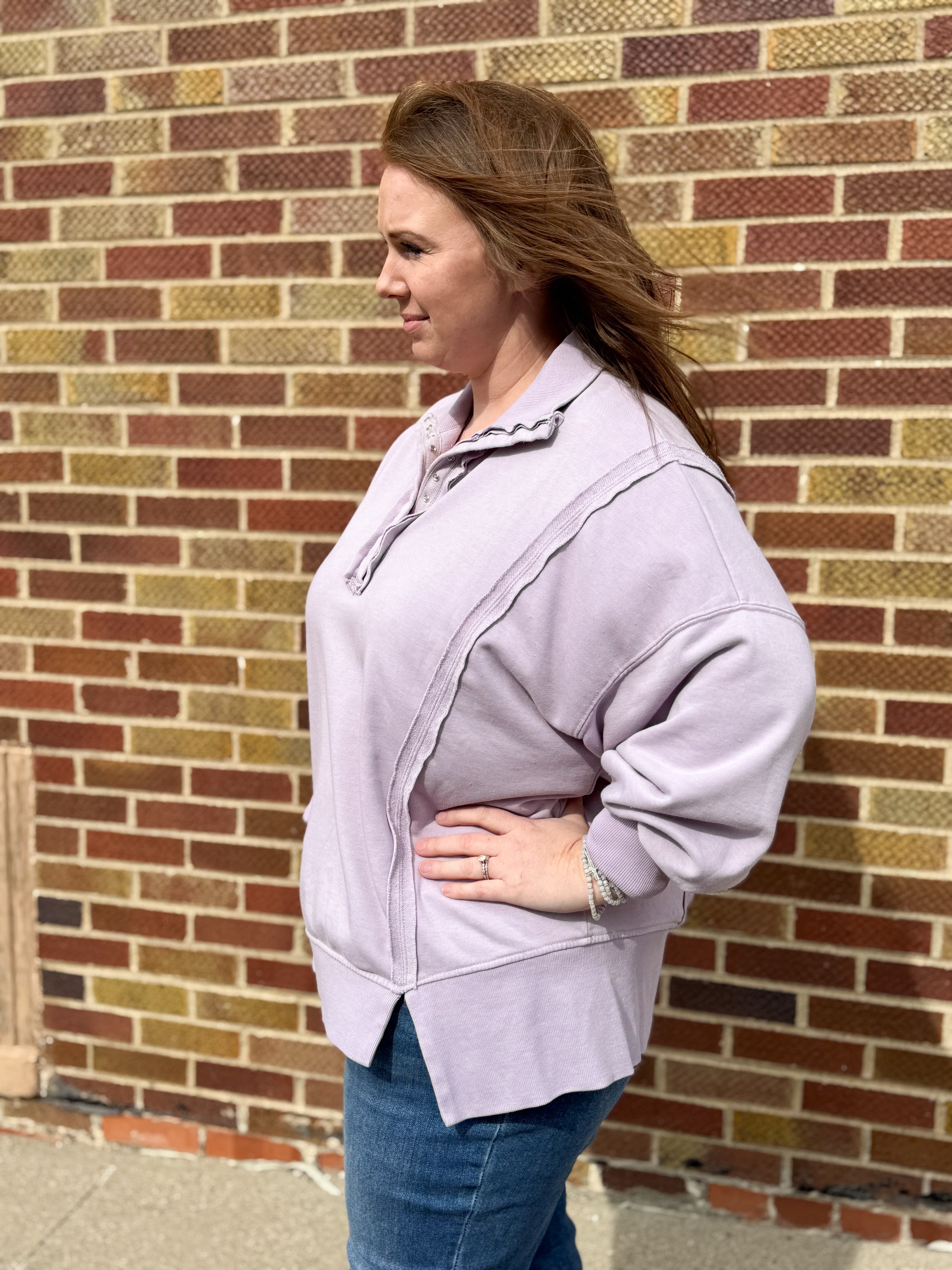 Crafted from mineral-washed French terry fabric, this oversized pullover features a relaxed fit, collared neckline with snap button closure, and exposed seaming details. Perfect for lounging, casual outings or layering.