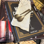 This set of two antique brass metal spoons is perfect for adding a touch of sophistication to any kitchen. Made from durable metal and measuring 4-4.75”, they come in a convenient drawstring bag for easy transport and storage.